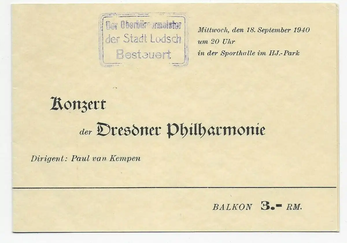 Carte de concert 1940: Concert Dresdner Philharmonie avec une série de conférences à Lodsch