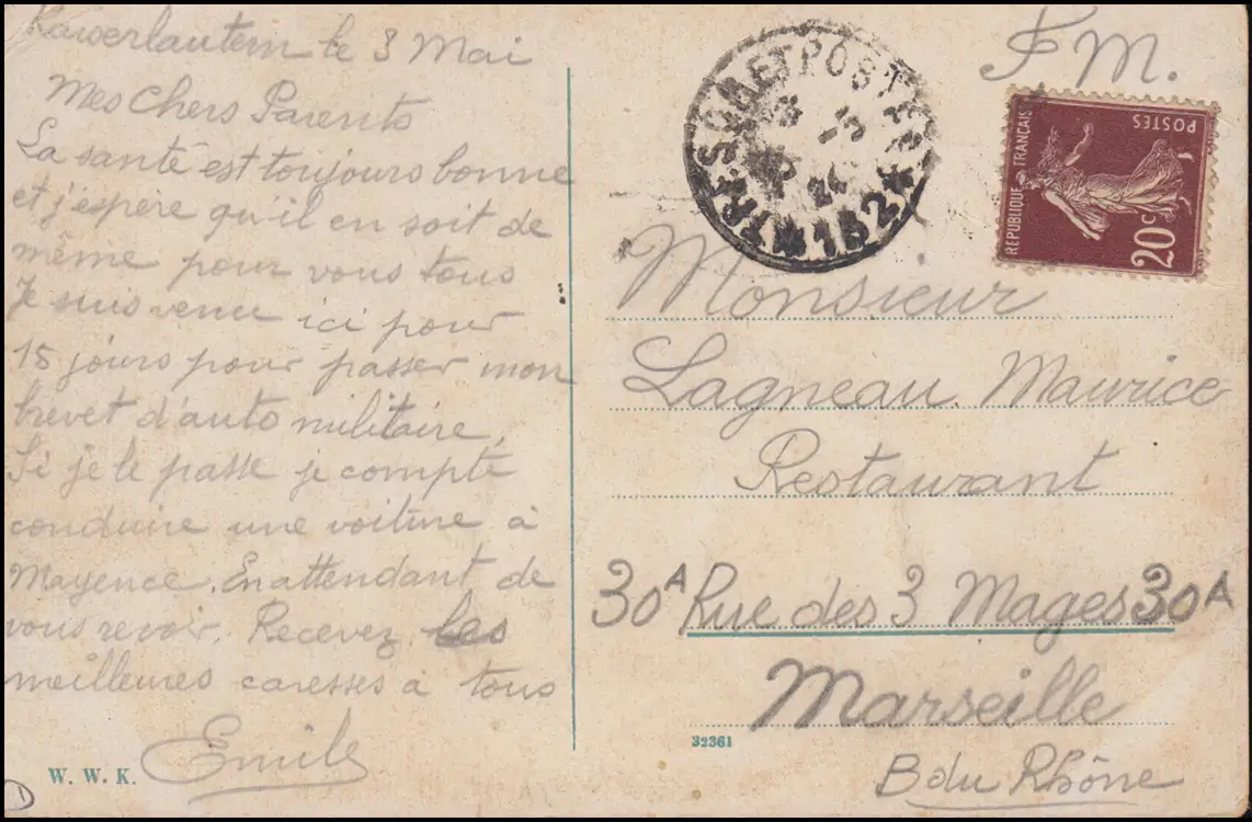 Carte bilingue de l'administration française à Kaiserslautern, coins partiellement heurtés Examen: original Référence produit: 00000000016796