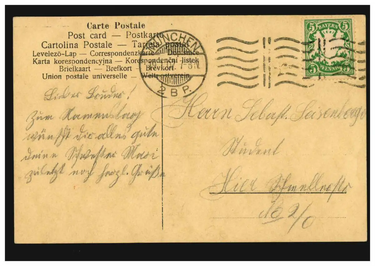Carte de la carte de nom de l'anniversaire de bonheur, MUNICH 19.1.1907
