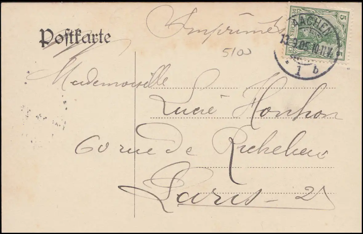 Carte de la forêt de Schlösschen dans la Forêt de ville à AACHEN 13.9. 1905