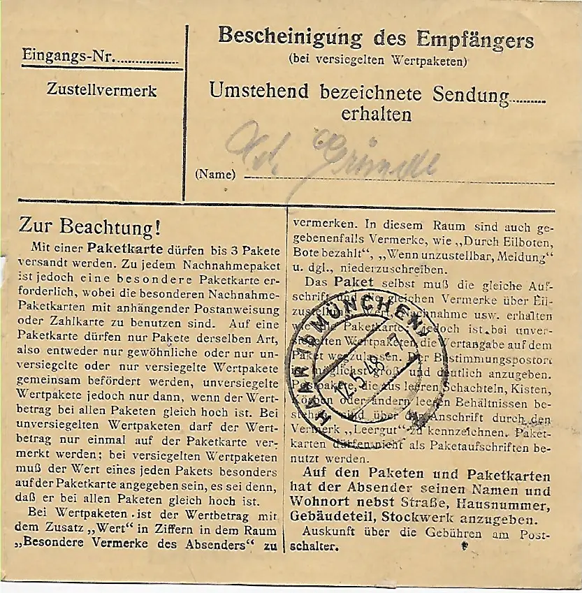 Carte de la valeur de Nagel à l'établissement de soins de santé Eglfing, 1948
