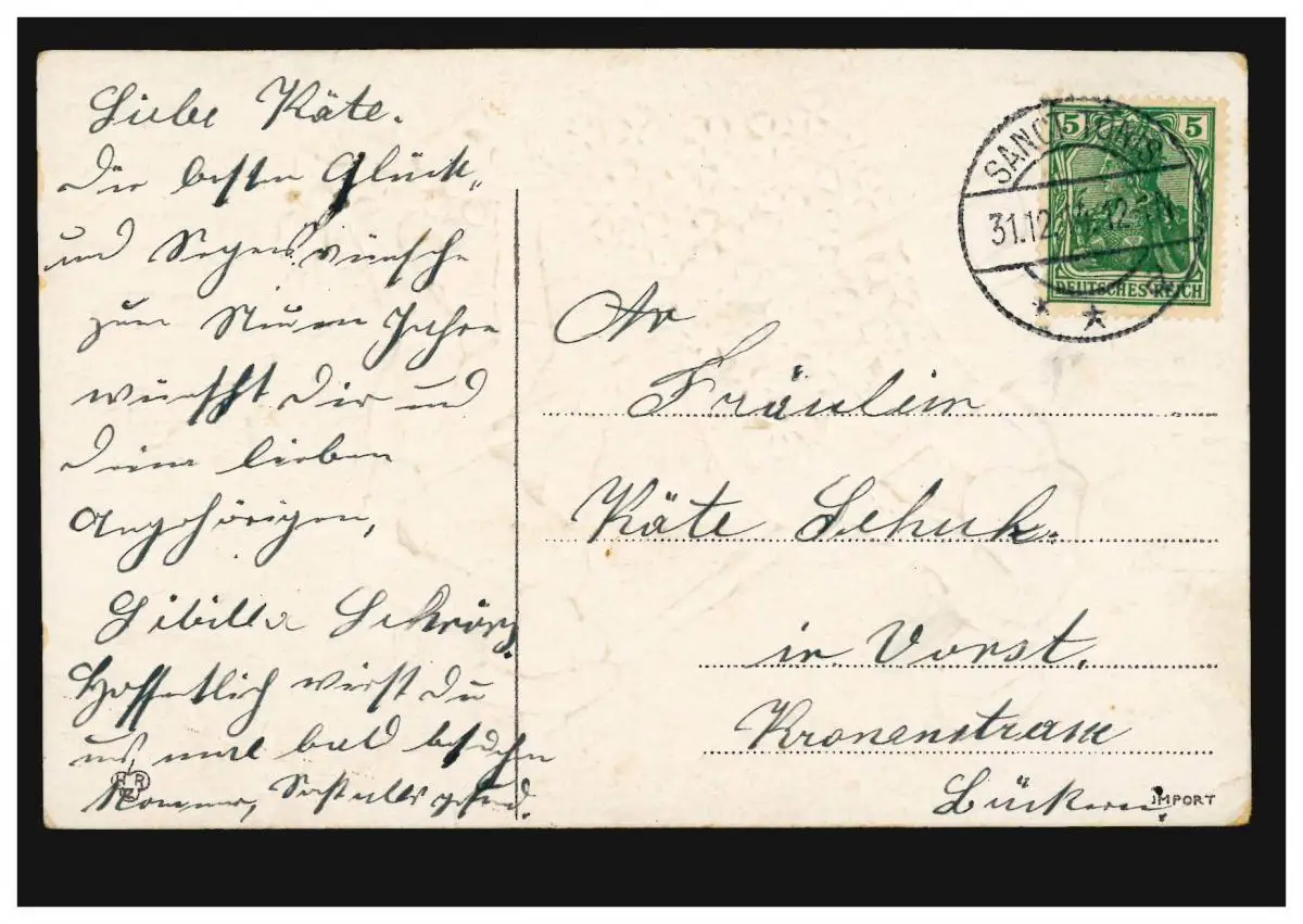 Carte de l'année Nouvel An Garçons avec brouette et trèfle chanceux, SANCT TÖNIS 31.12.1914