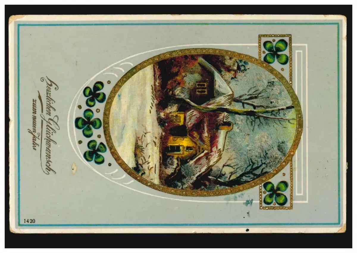 Carte de l'année Nouvel An Maison dans le paysage hivernal Glückskleegirlande, ATZBACH 3.1.1912