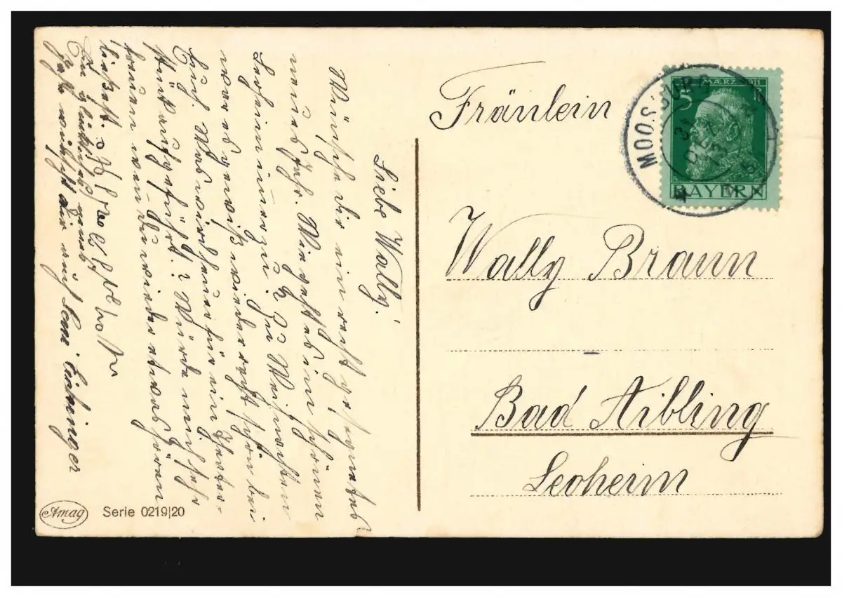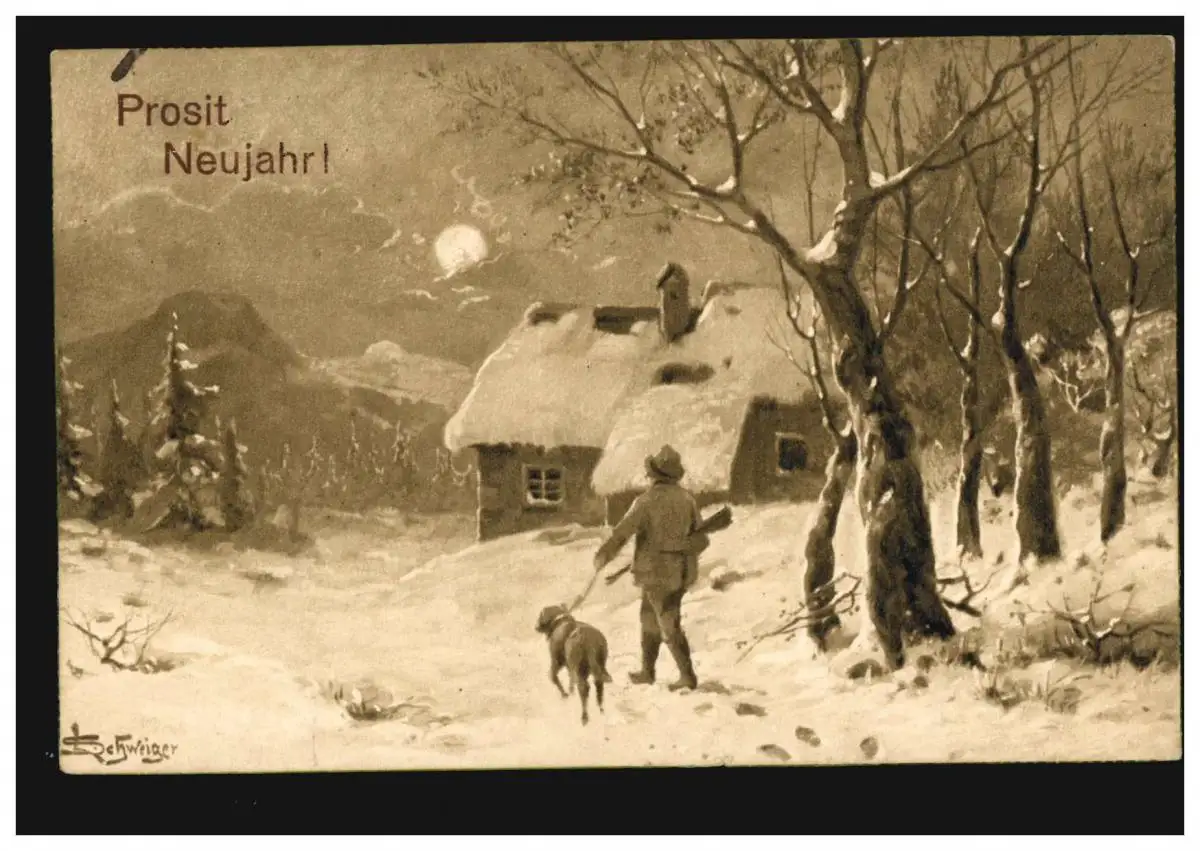 Carte de l'année Nouvel An Paysage d'hiver, chasseur et chien, MOSSBURG 31.12.1913