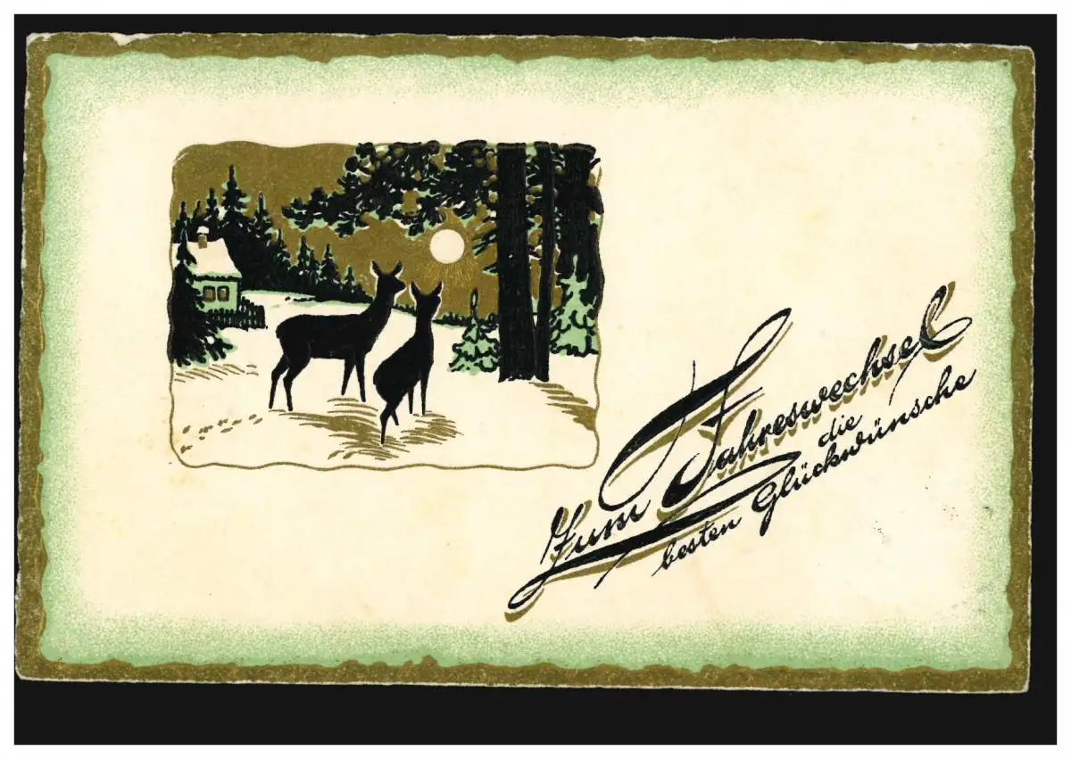 Carte de l'année Nouvel An Paysage hivernal avec des cerfs la nuit, BISCHOFSWERDA 31.12.34