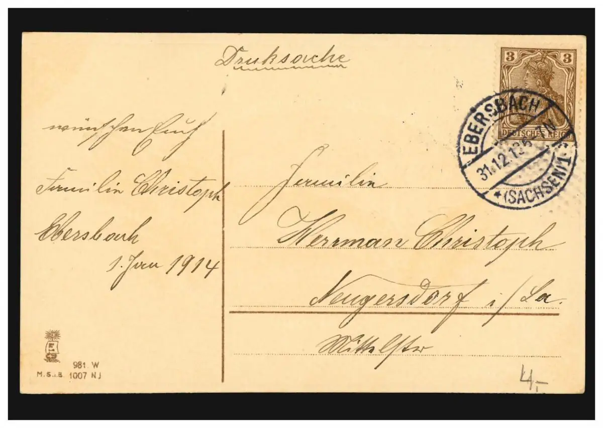 Carte de l'année Nouvel An Route chanceuse Train ferroviaire en hiver, EBERSBACH 31.12.1913