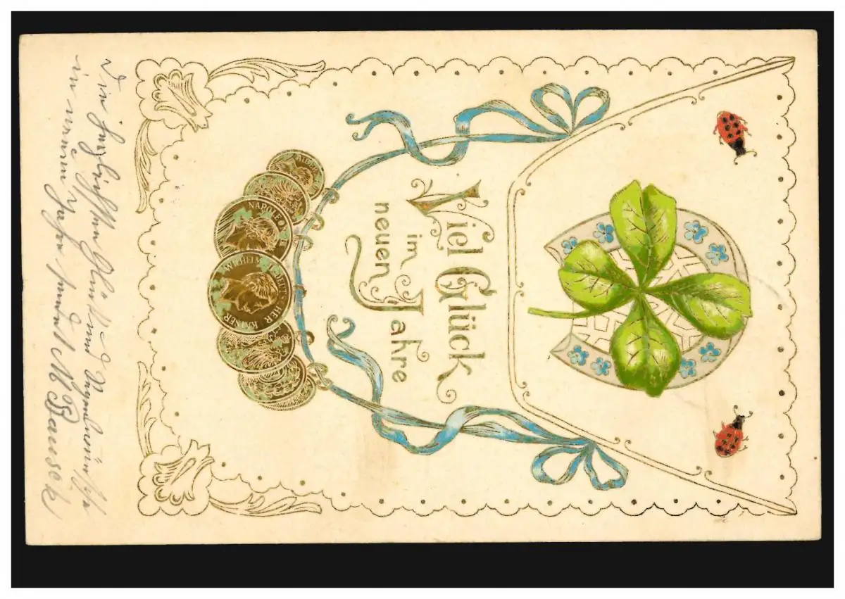 Carte de l'année Nouvel An Trèfle à quatre feuilles avec pièces d'or,WILD 31.12.1903
