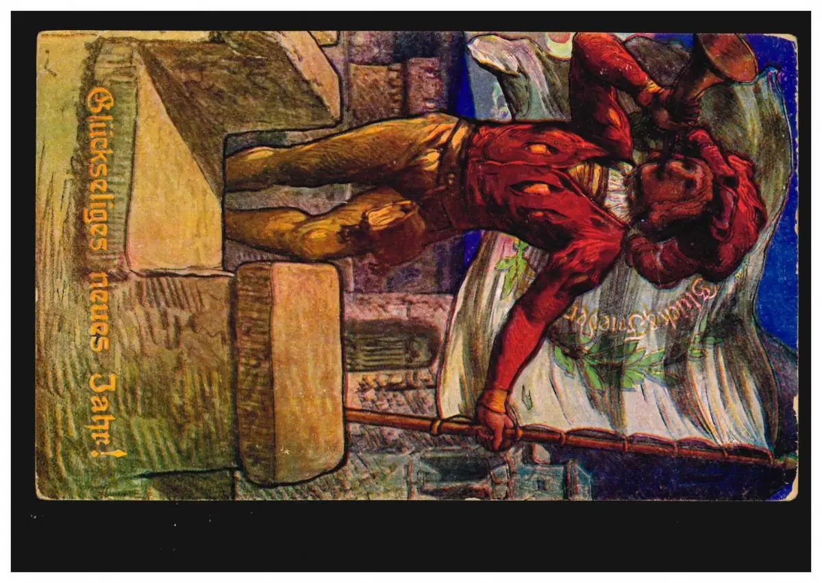 Carte de l'année Nouvel An Trompeter sur mur de la ville avec drapeau, BERLIN 1.1.2001