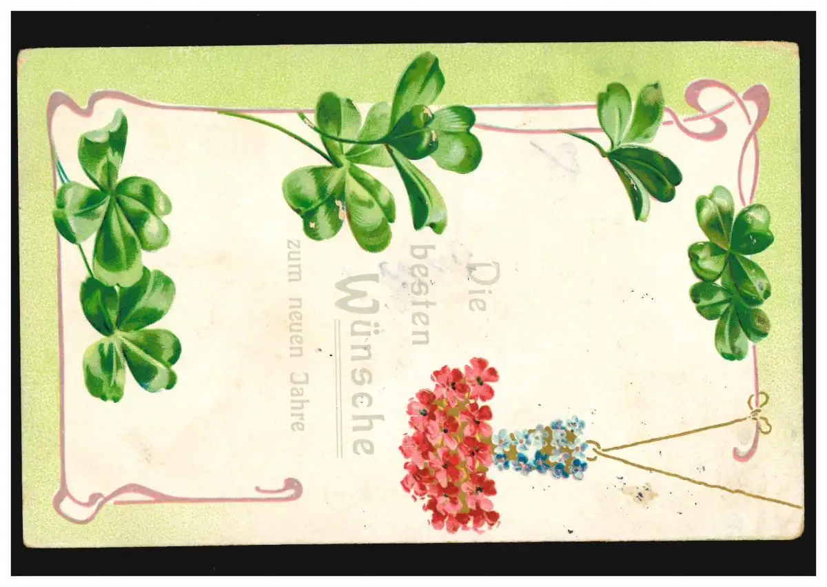 Carte de l'année Nouvelle Girlande de la Trèfle de Bonne Chance avec bouquet de fleurs, ACHEN 31.12.1906