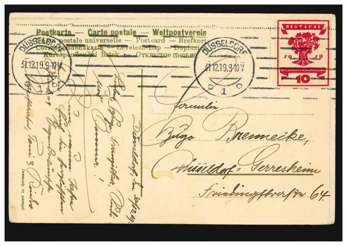 Carte de l'année de la nouvelle année nombre 1 image de paysage de glaçons, DÜSSELDORF 31.12.1919