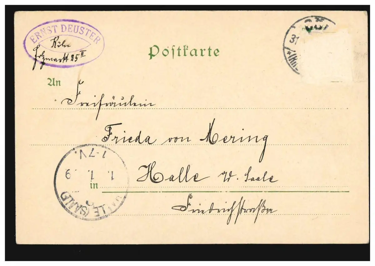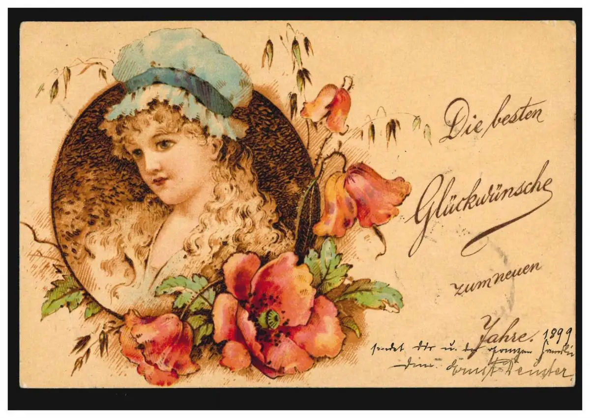 Carte de l'exposition Nouvel An Femme avec capot et guirlande fleurie, CÖLN d'après HALLE/SAALE
