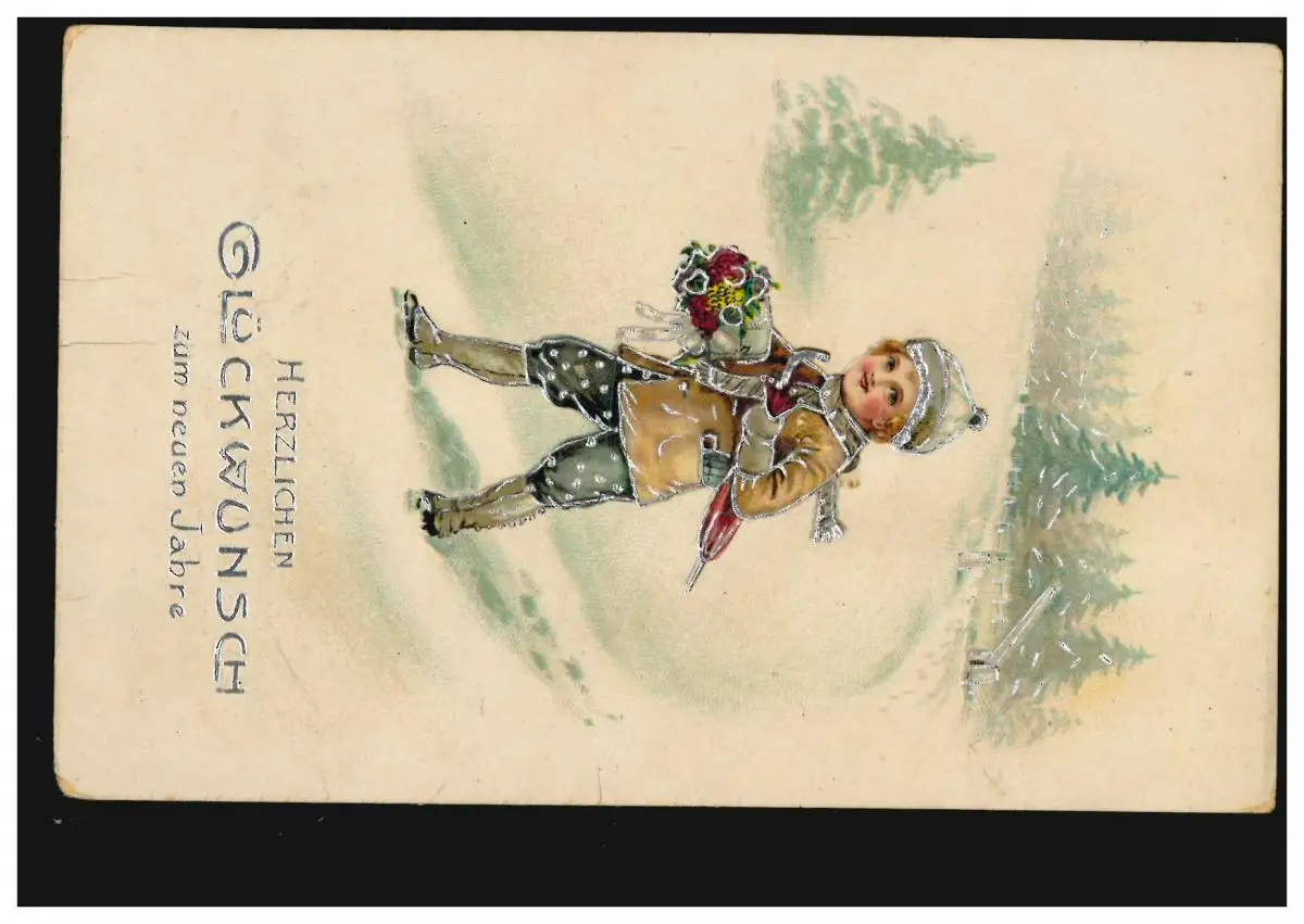 Carte de l'exposition Nouvel An Paysage hivernal Enfant avec fleurs, Poste de champ STUTTGART 1917