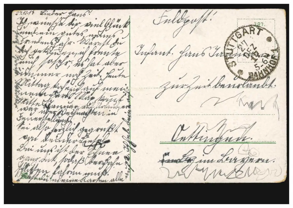 Carte postale de champ avec cachet quotidien Encercle STUTTGART BAHNHOF 27.12.1917, carte argentée Vérification: originale Référence produit: 00000000042261