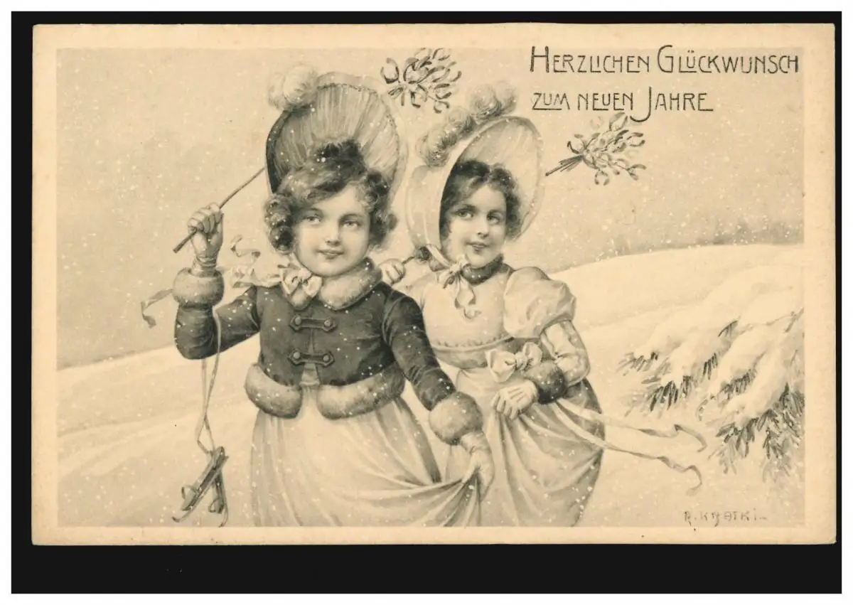 Carte de l'image Nouvel An Deux filles avec patins à glace, MUNICH 31.12.1907