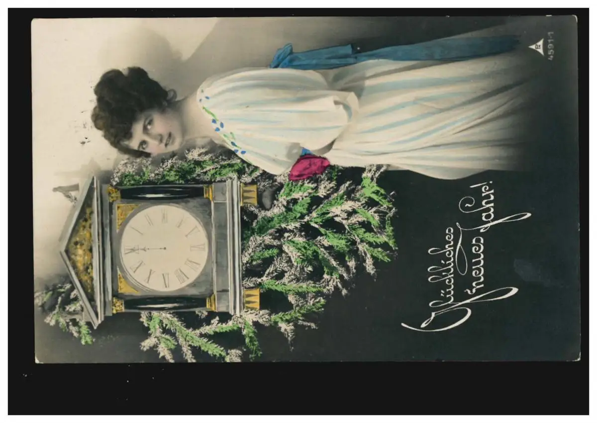 Carte de l'image Nouvel An femme avec montre, colorié, NOUVEAUREF (ERZGEB.) 30.12.1919