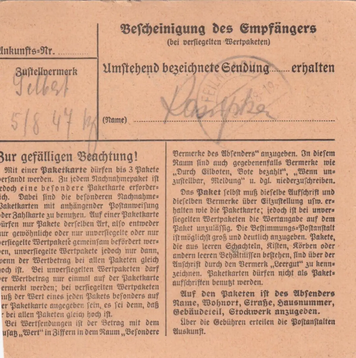 Carte de paquet 1947: Berlin-Wilmersdorf vers Feilnbach, U.S. Zone