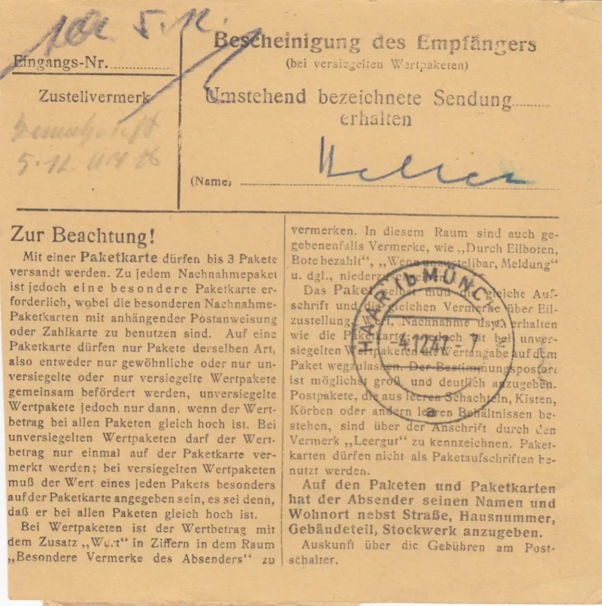 Carte de paquet 1947: Buchloe par cheveux, carte de valeur