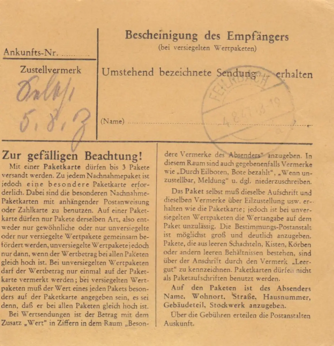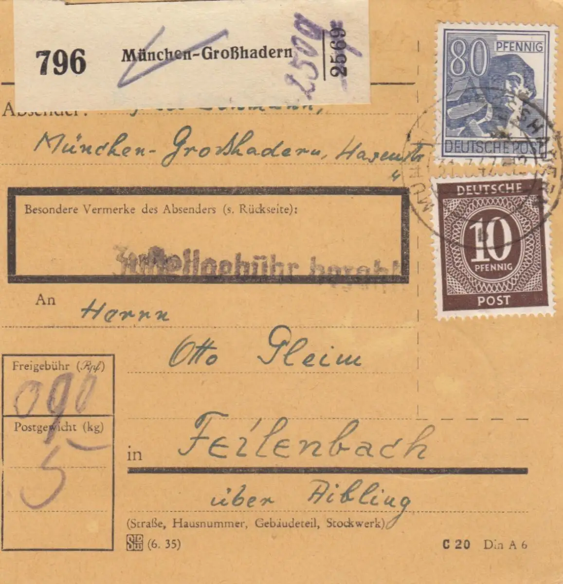 Carte de paquet 1947: Munich-Großhadern vers Feilnbach