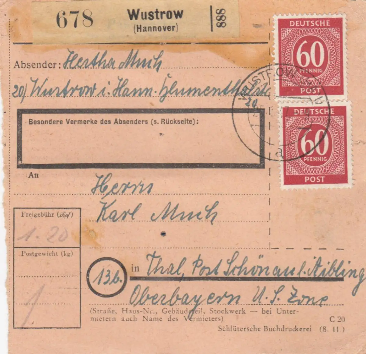 Carte de paquet 1947: Wustrow Hannover vers Thal, Post Schönau