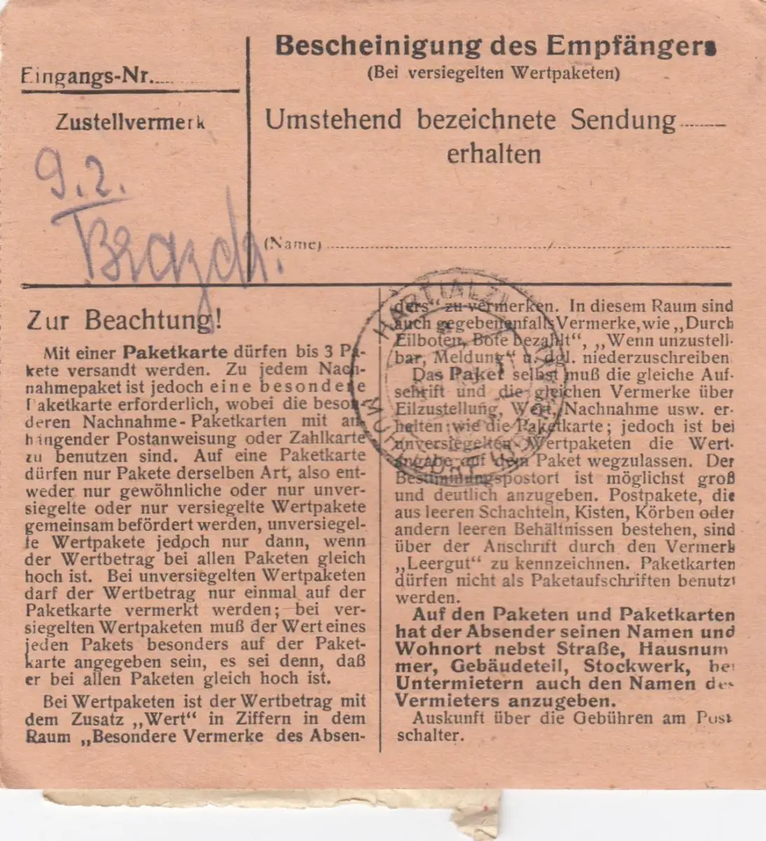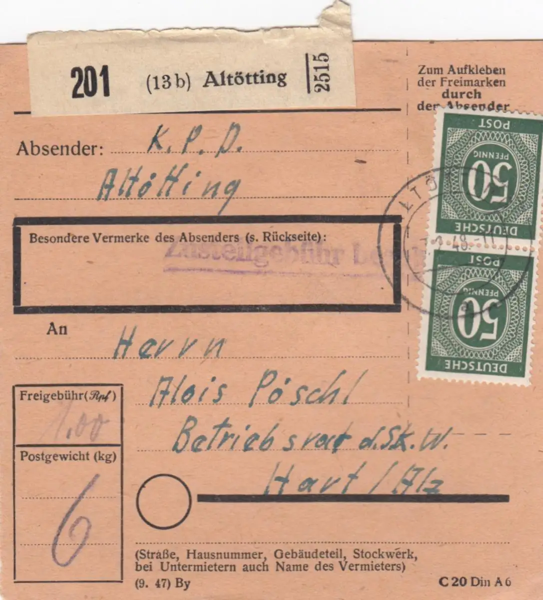 Carte de paquet 1948: Altötting a Hart, avant-projet de service du SKW