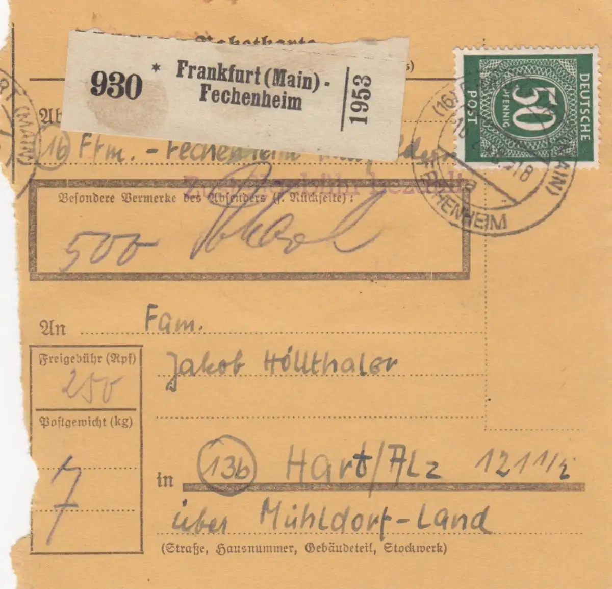 Carte de paquet 1948: Francfort vers Hart via Mühldorf-Land