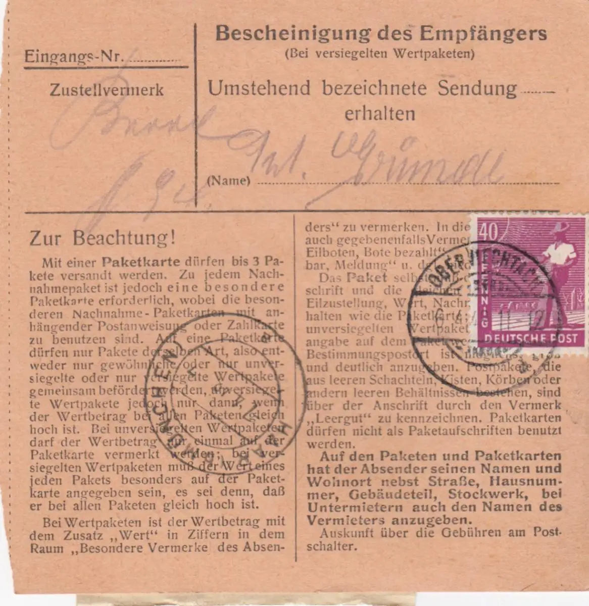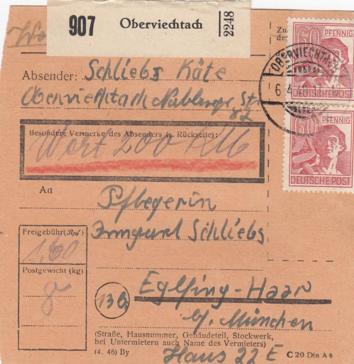 Carte de paquet 1948: Oberviechtach d'après Eglfing, infirmière, carte de valeur