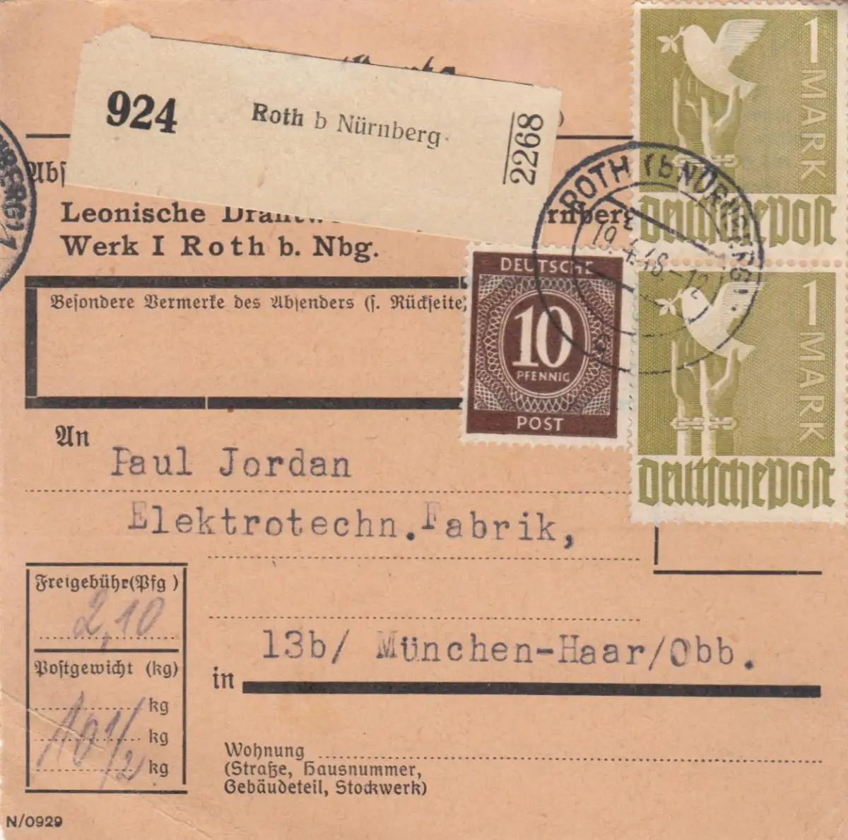 Carte de paquet 1948: Roth bei Nuremberg a Haar, Auto-booker