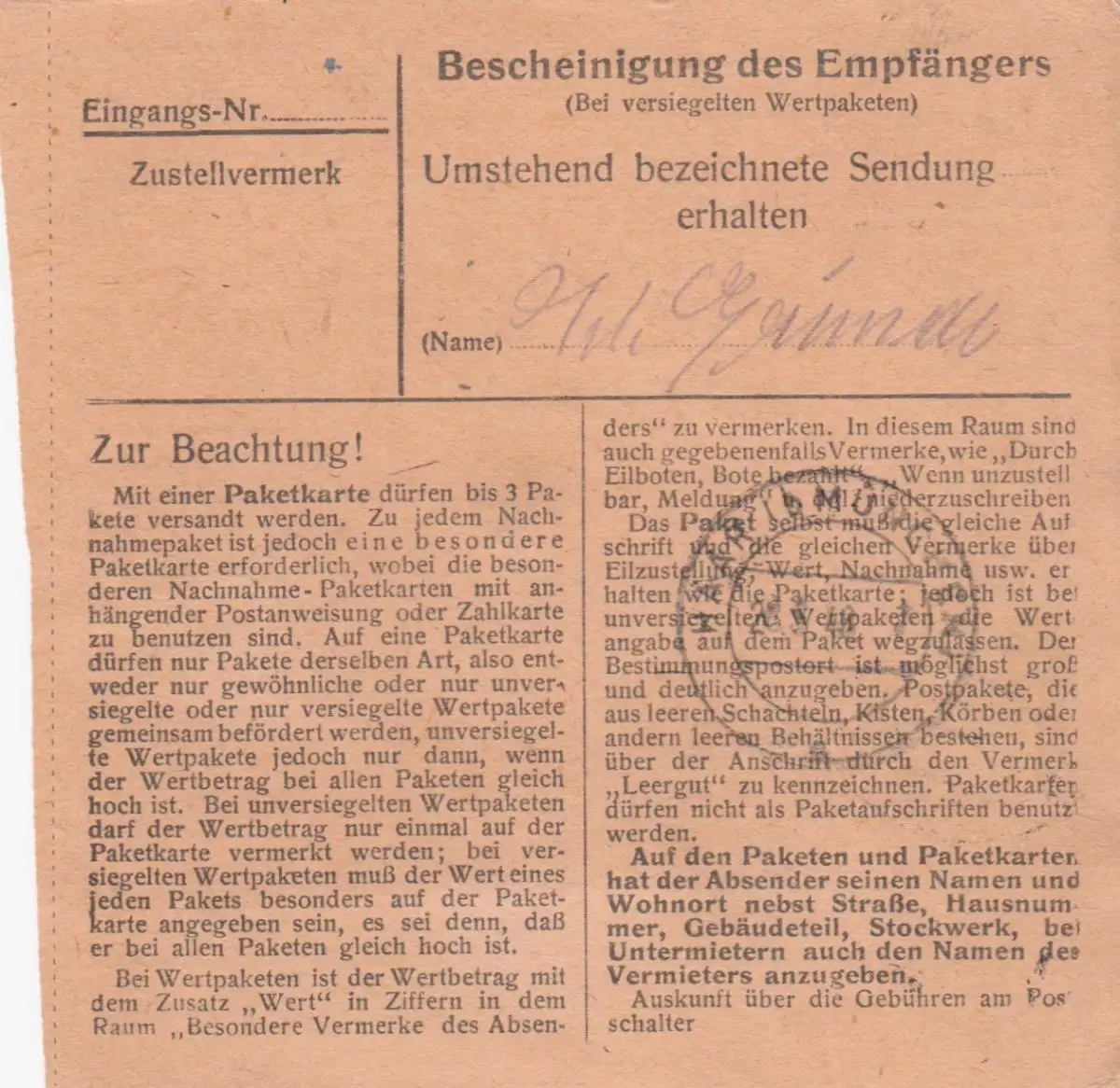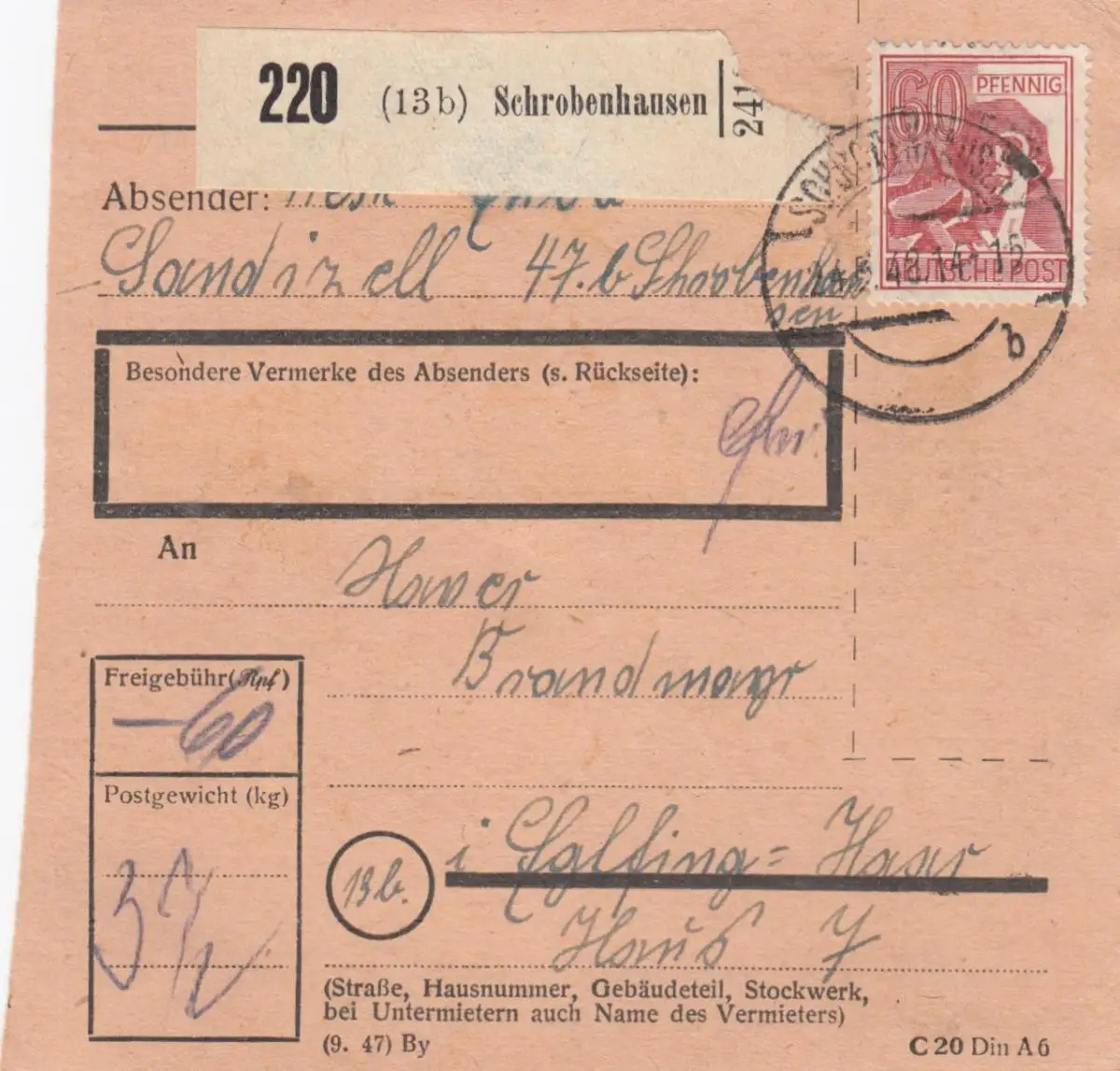 Carte de paquet 1948: Sandizell Schrobenhausen a Eglfing