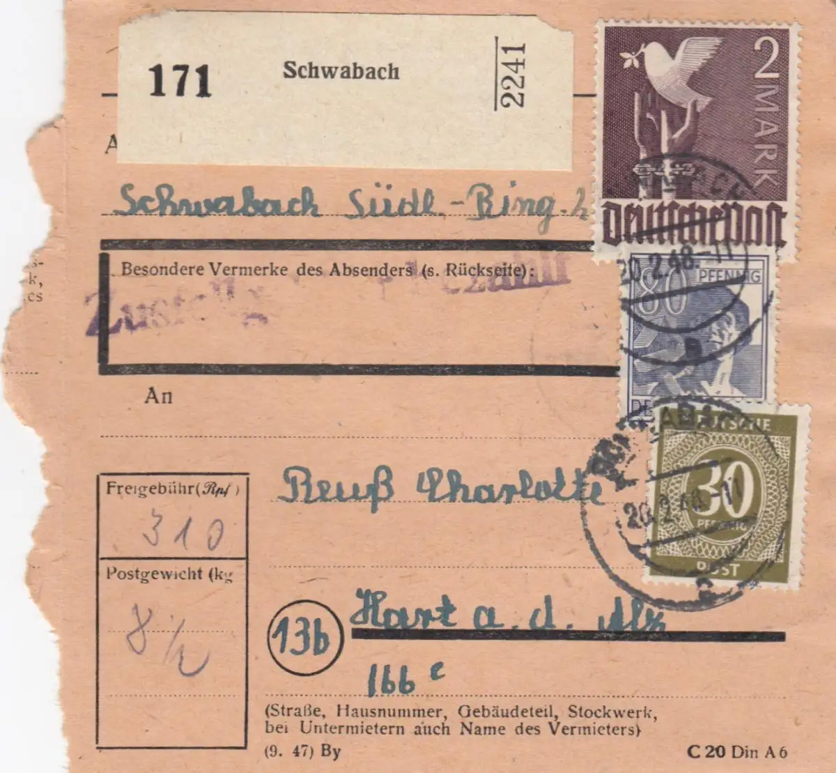 Carte de paquet 1948: Schwabach vers Hart a.d. Alz