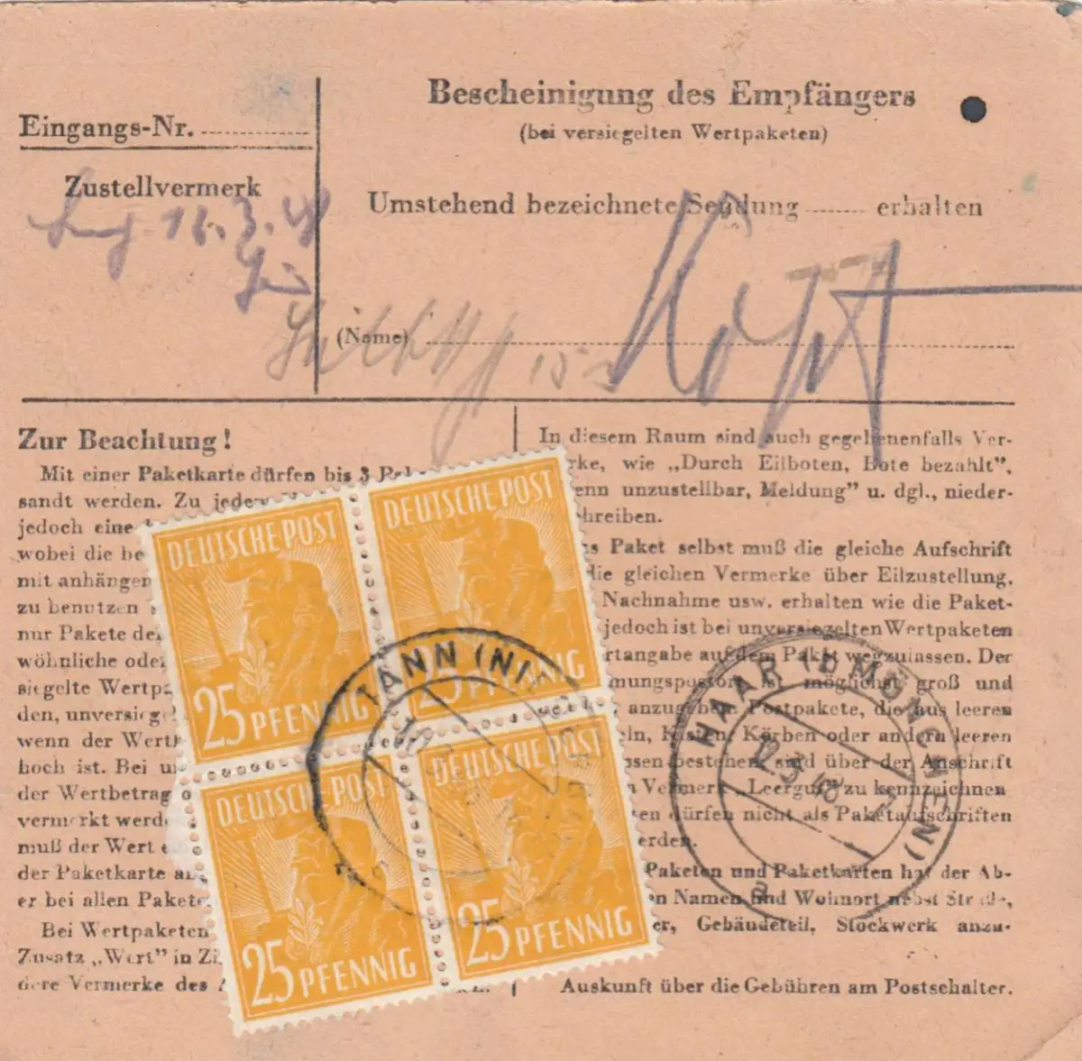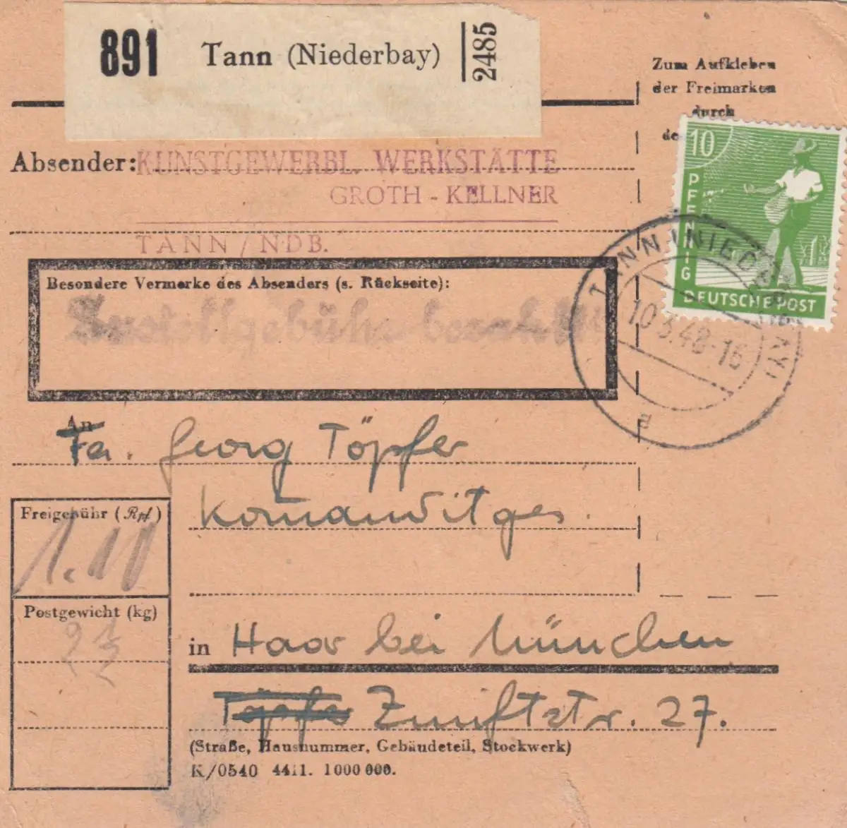 Carte de paquet 1948: Tann, atelier d'art par cheveux
