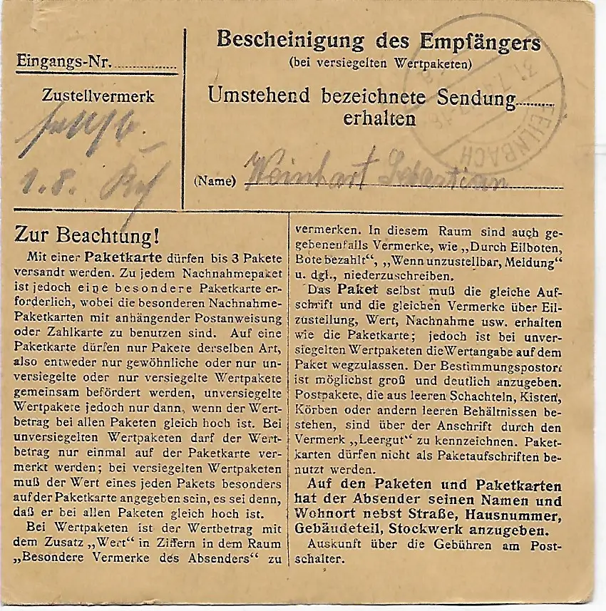 Carte de paquet Altdorf/Nürnberg vers Untersteinach, 1947, MeF