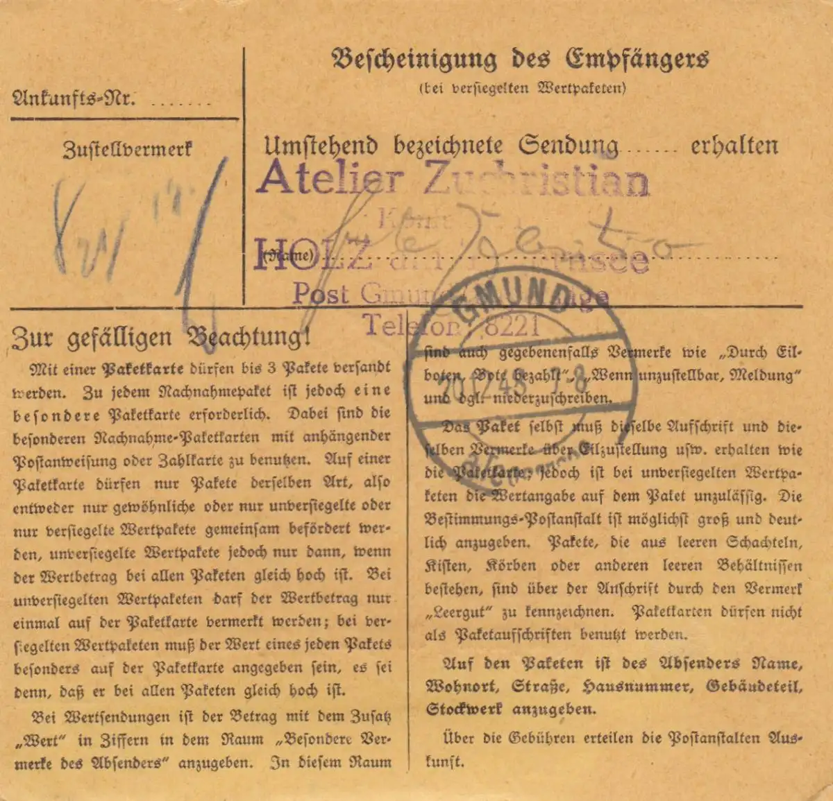 Carte de paquet BiZone 1948: Arnsberg d'après Holz Bayersäge, carte auto-réservation avec valeur