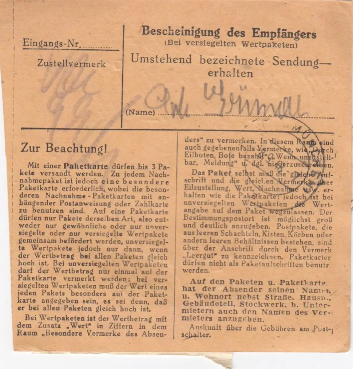 Carte de paquet BiZone 1948: Bernried b. Metten selon les cheveux b . moule