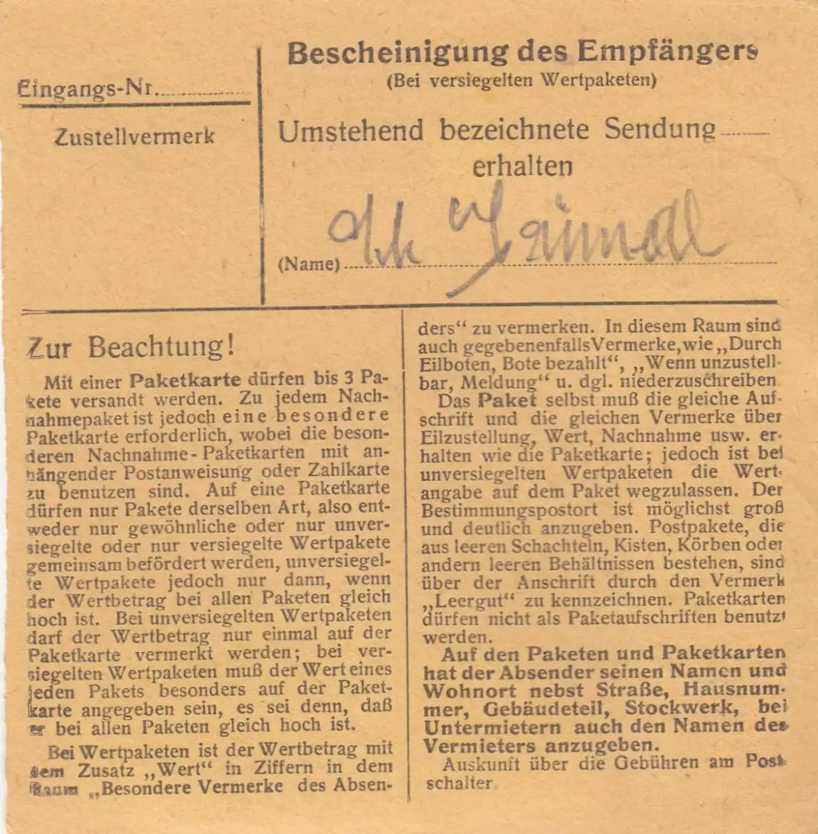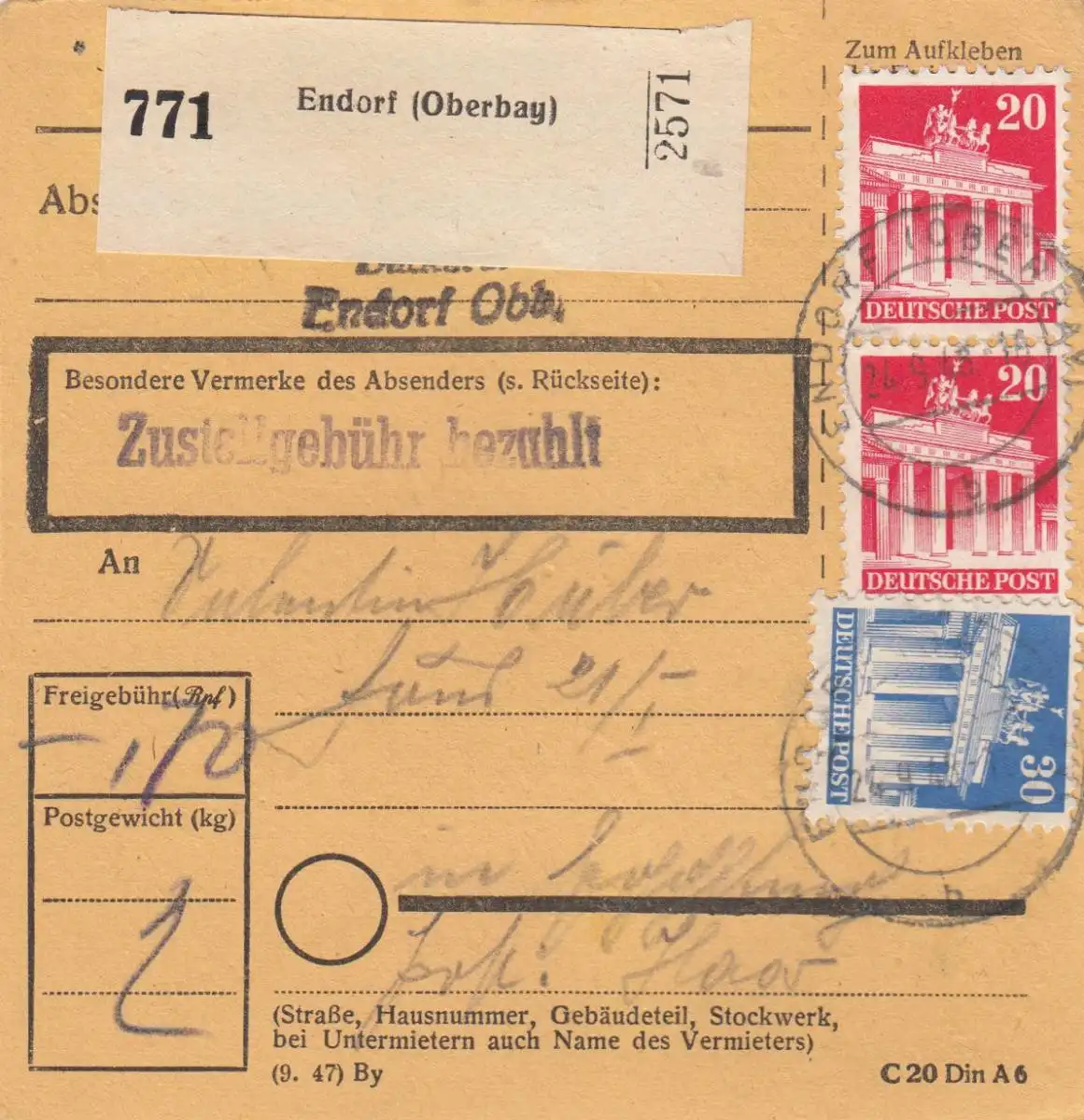 Carte de paquet BiZone 1948: Endorf (Oberbay) par cheveux