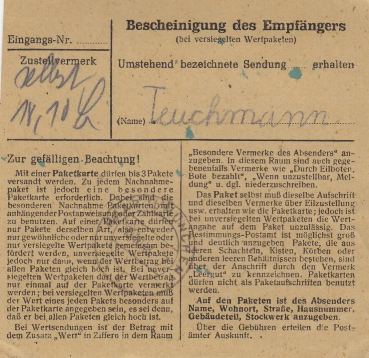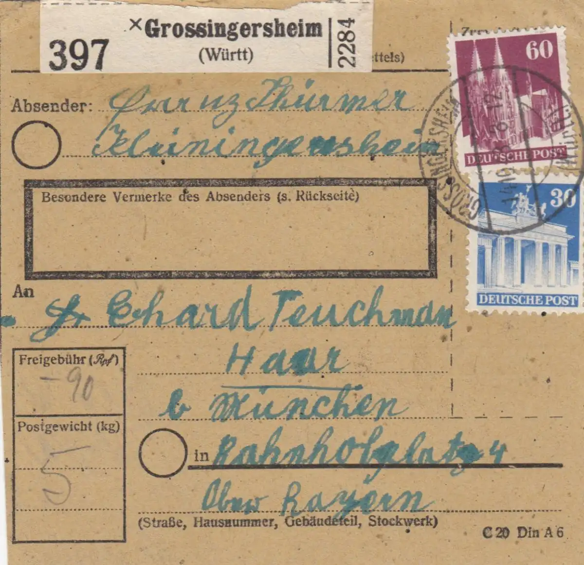 Carte de paquet BiZone 1948: Grossingersheim à Haar près de Munich
