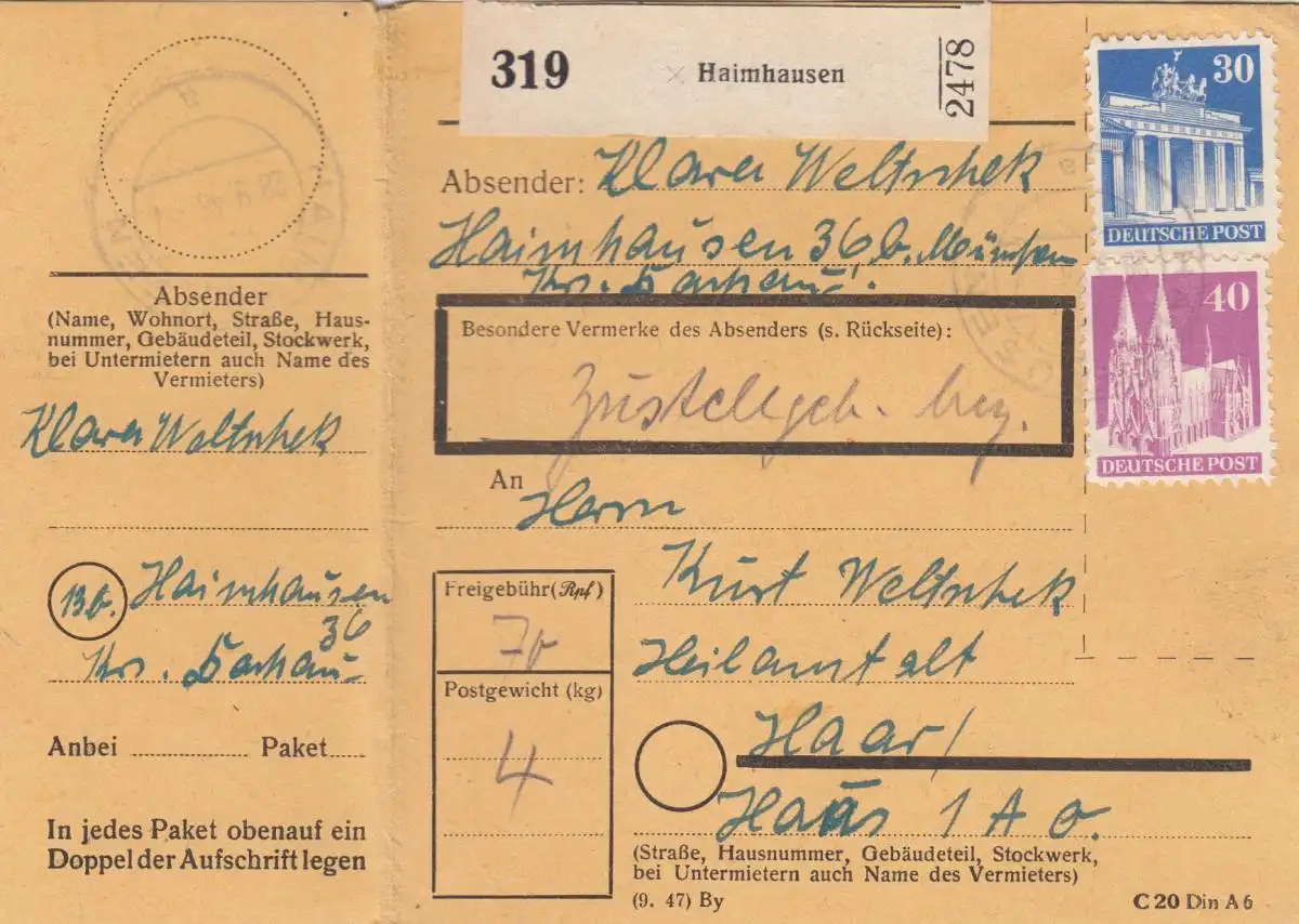 Carte de paquet BiZone 1948: Haimhausen après les cheveux, établissement de soins