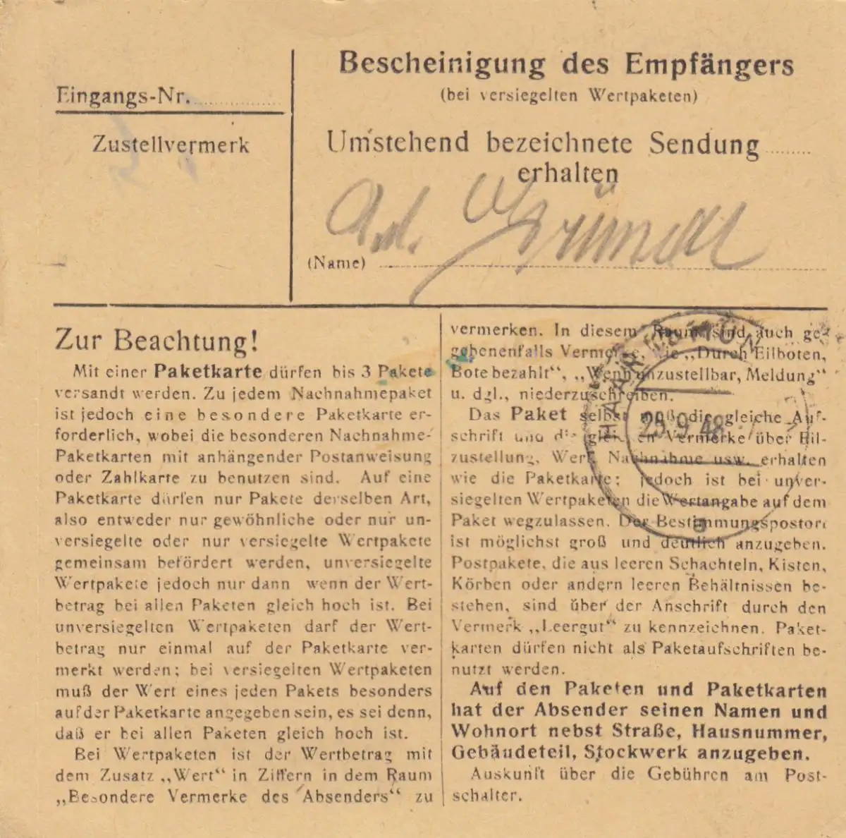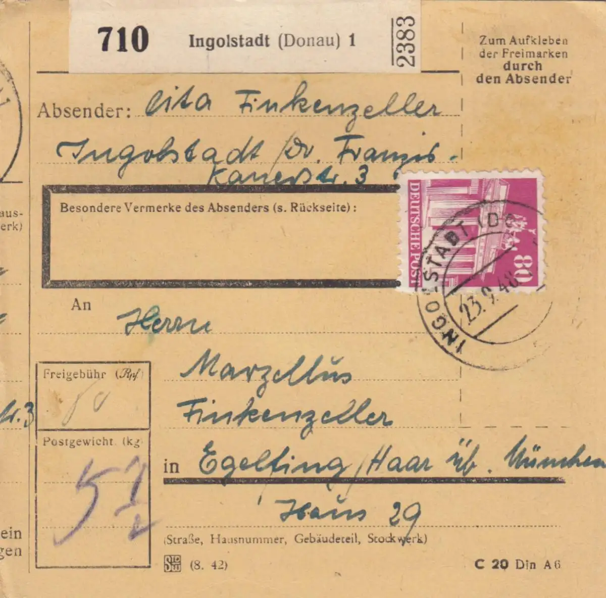 Carte de paquet BiZone 1948: Ingolstadt après Eglfing Haar b. Munich