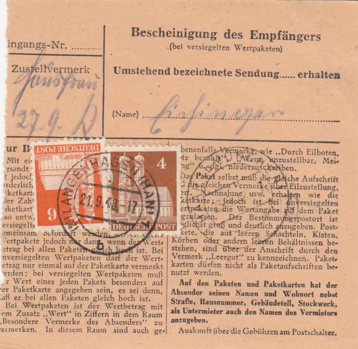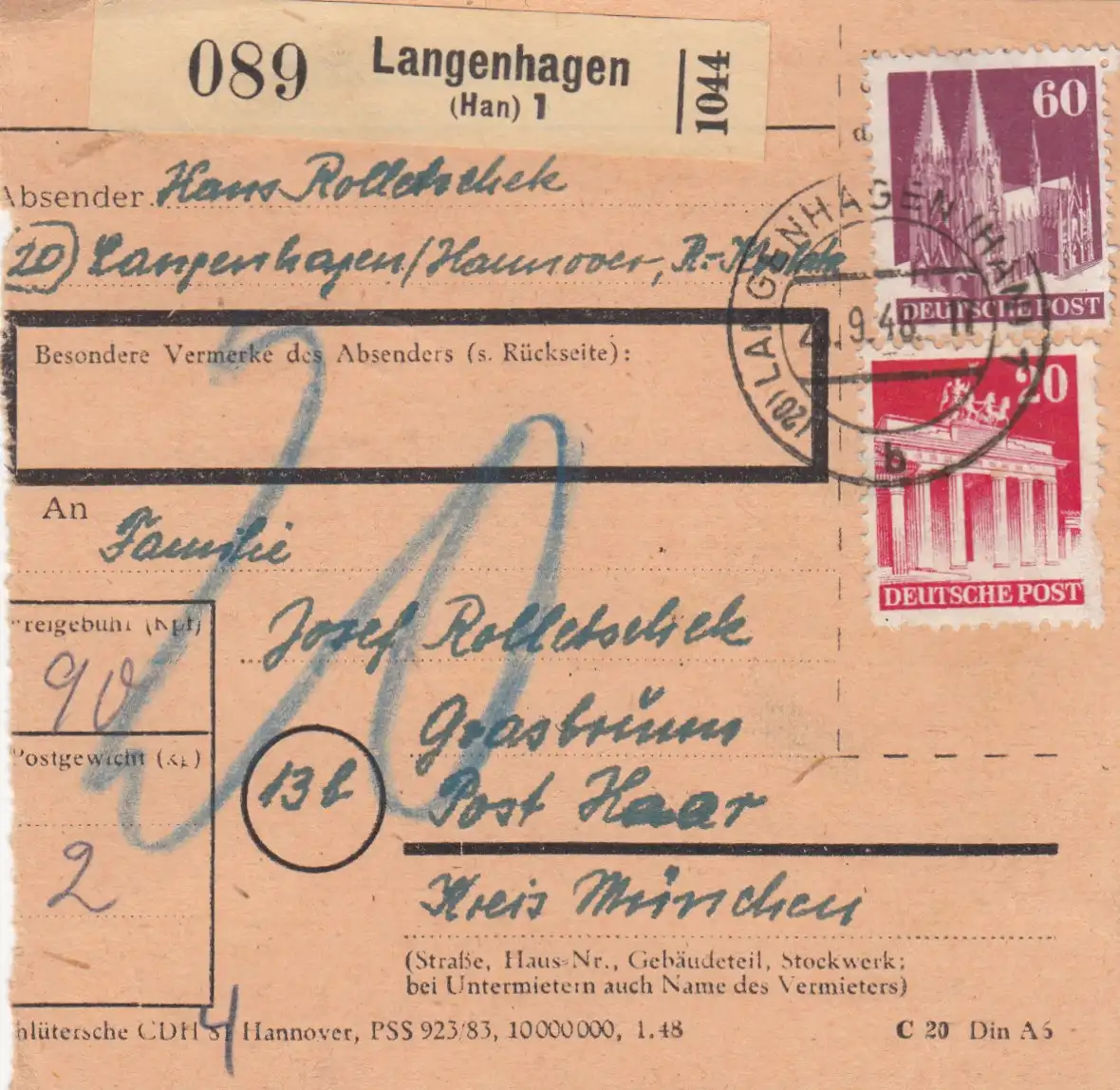 Carte de paquet BiZone 1948: Langenhagen après Haar Kreis Munich