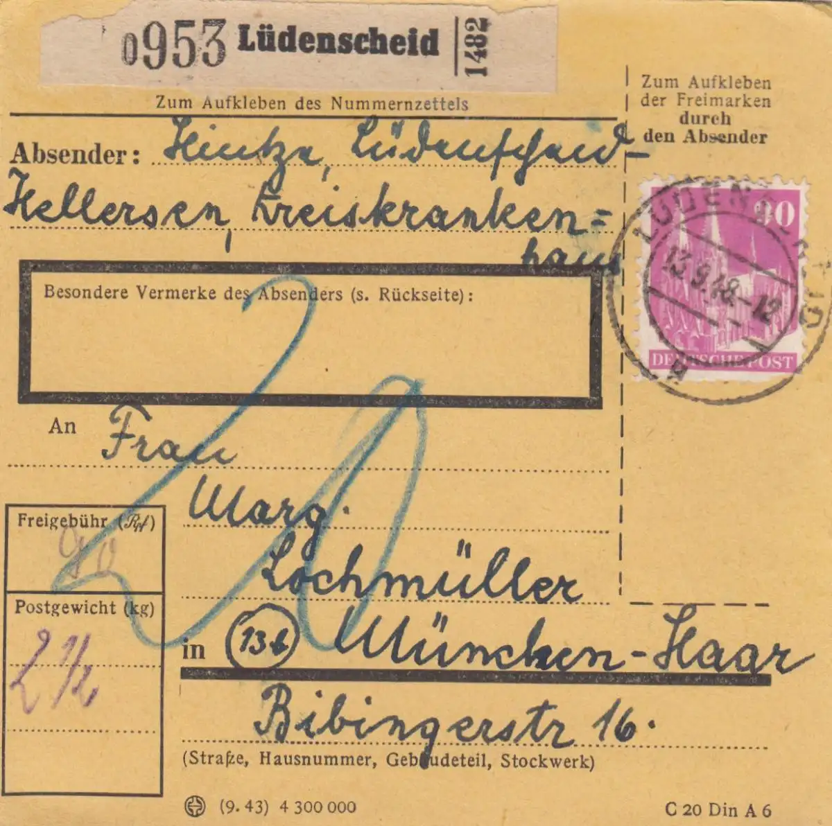 Carte de paquet BiZone 1948: Lüdenscheid vers Munich-Haar, frais supplémentaires
