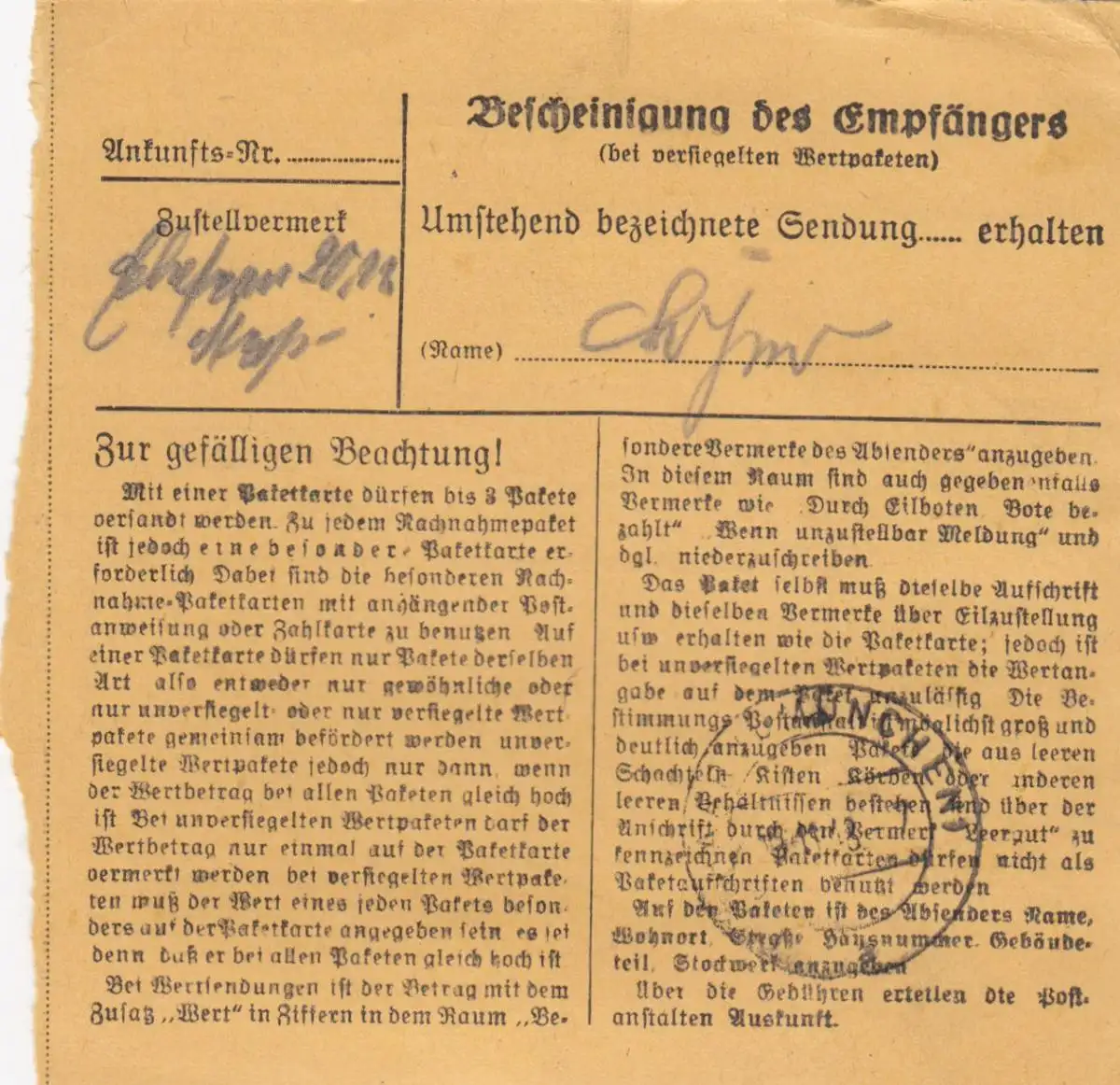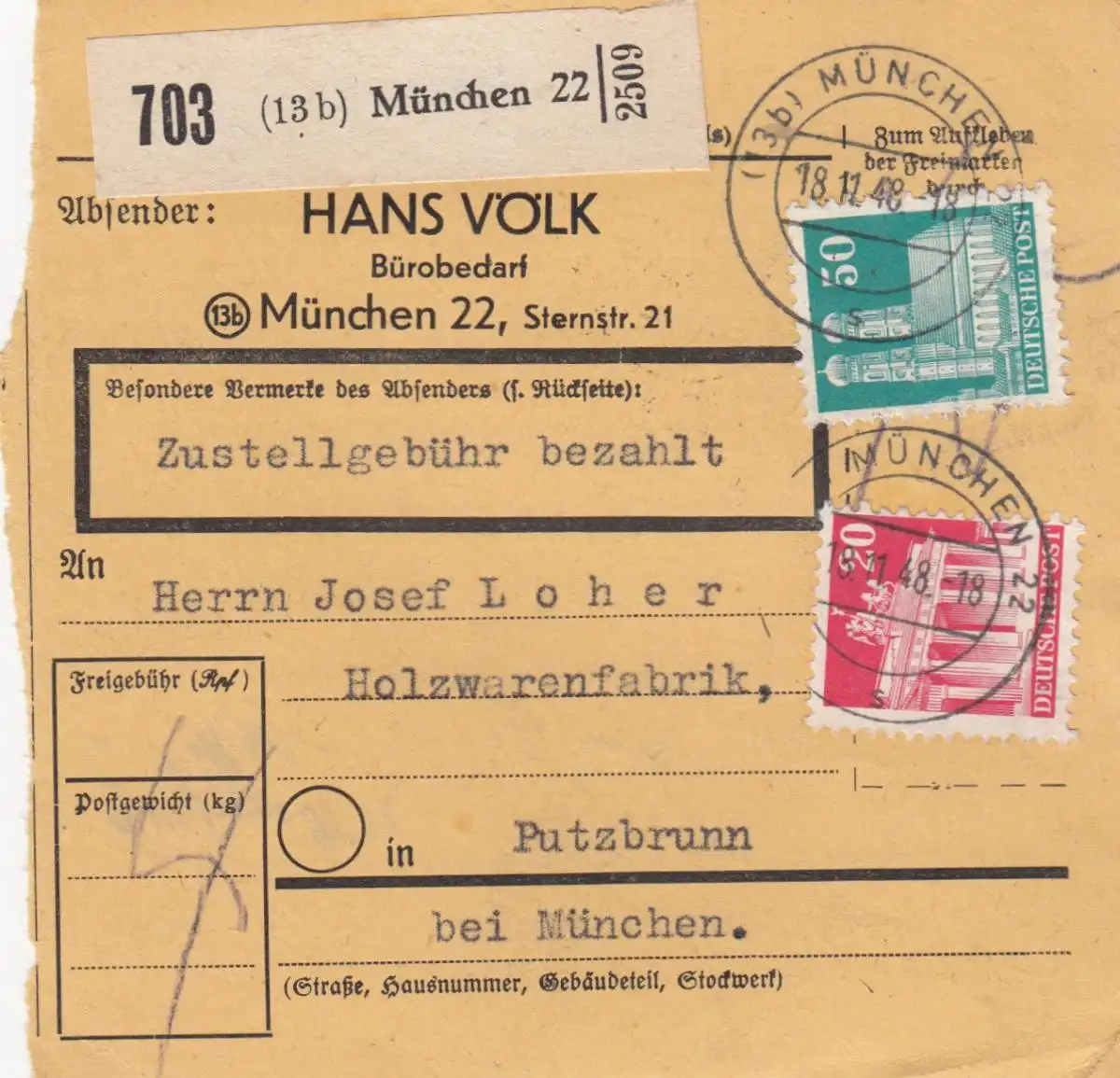 Carte de paquet BiZone 1948: Munich 22 selon Putzbrunn, carte auto-réservation avec valeur