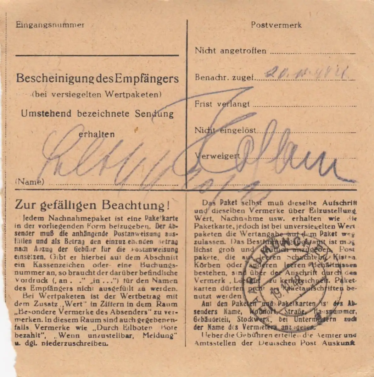 Carte de paquet BiZone 1948: Munich après Haar b. Munich, Acceptation