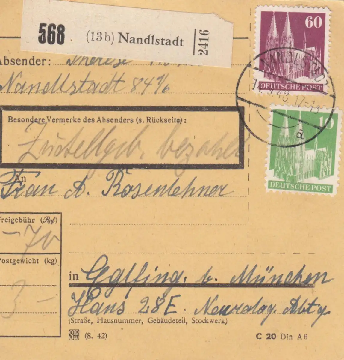 Carte de paquet BiZone 1948: Nandlstadt après Eglfing b. Munich