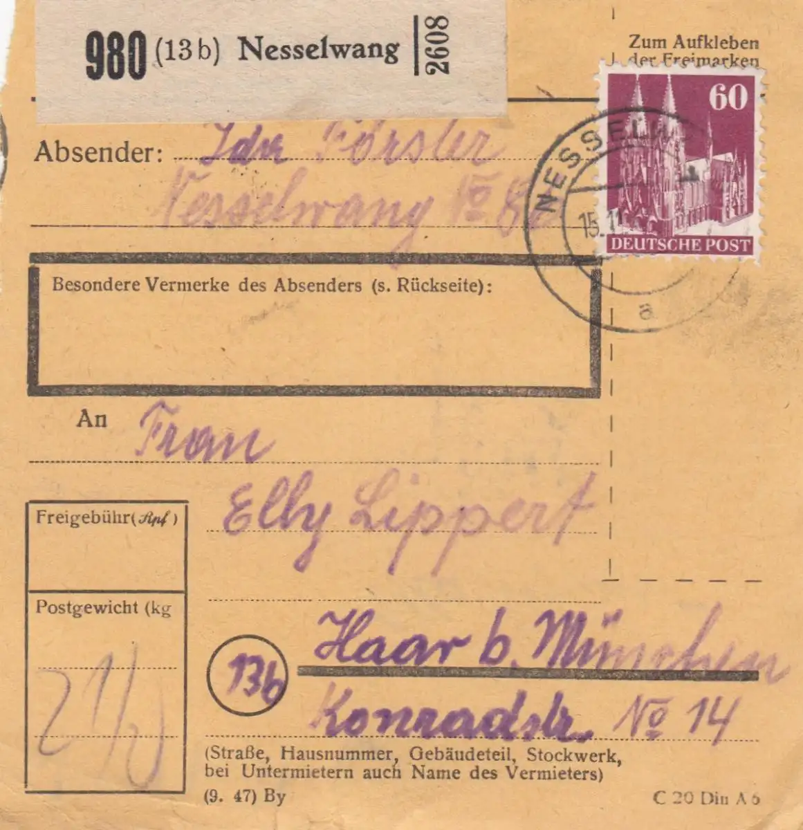Carte de paquet BiZone 1948: Nesselwang après Haar près de Munich
