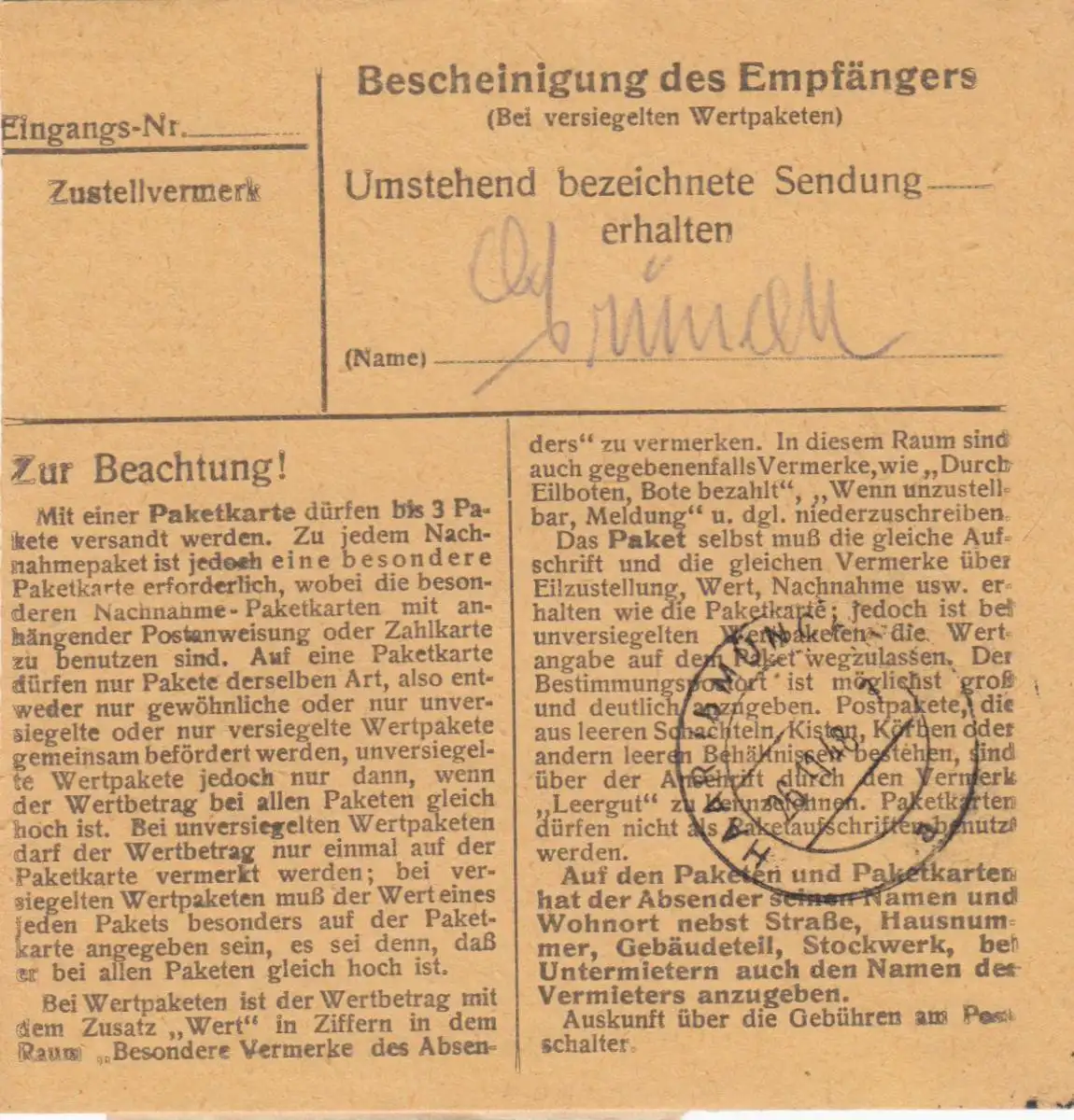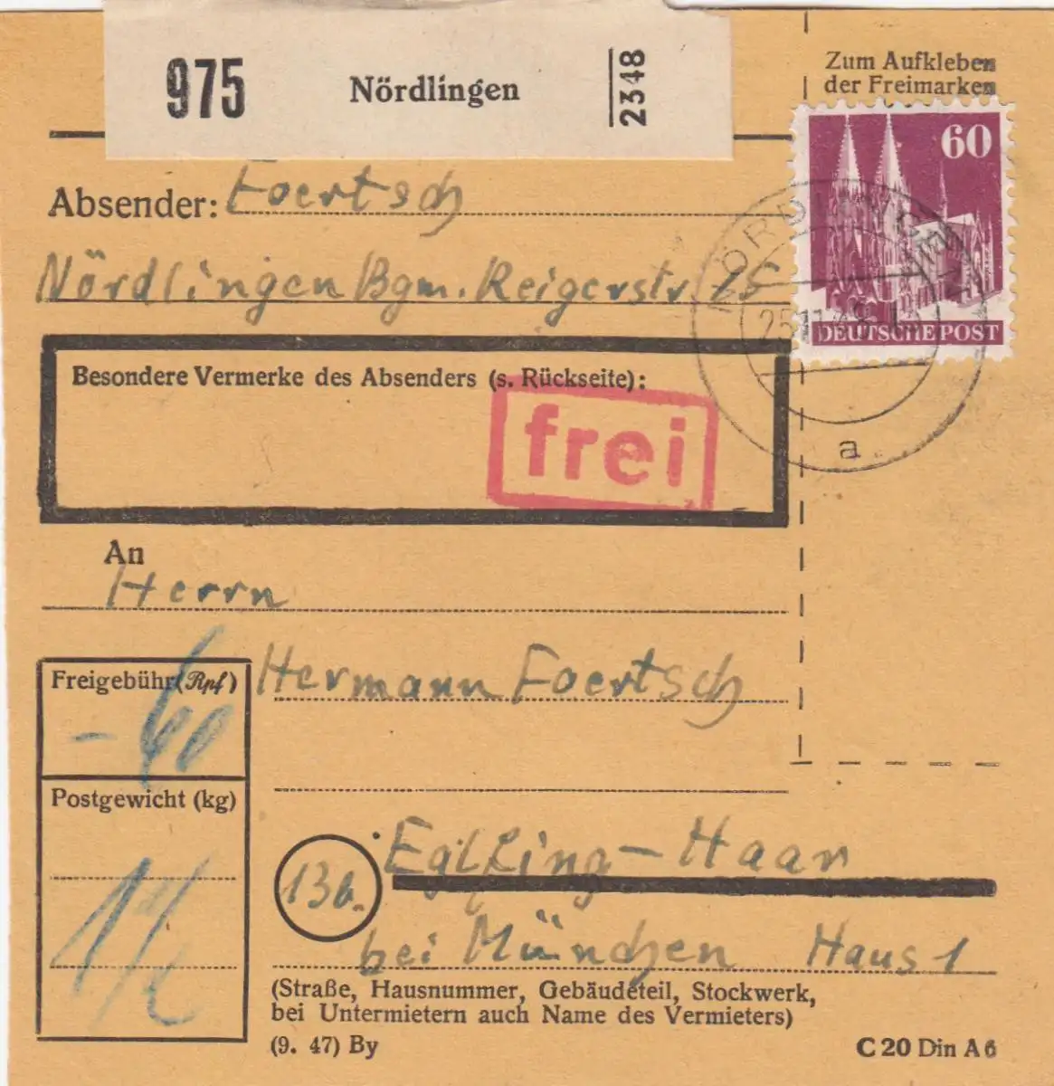 Carte de paquet BiZone 1948: Nördlingen selon Eglfing-Haar, mentions spéciales: exemption