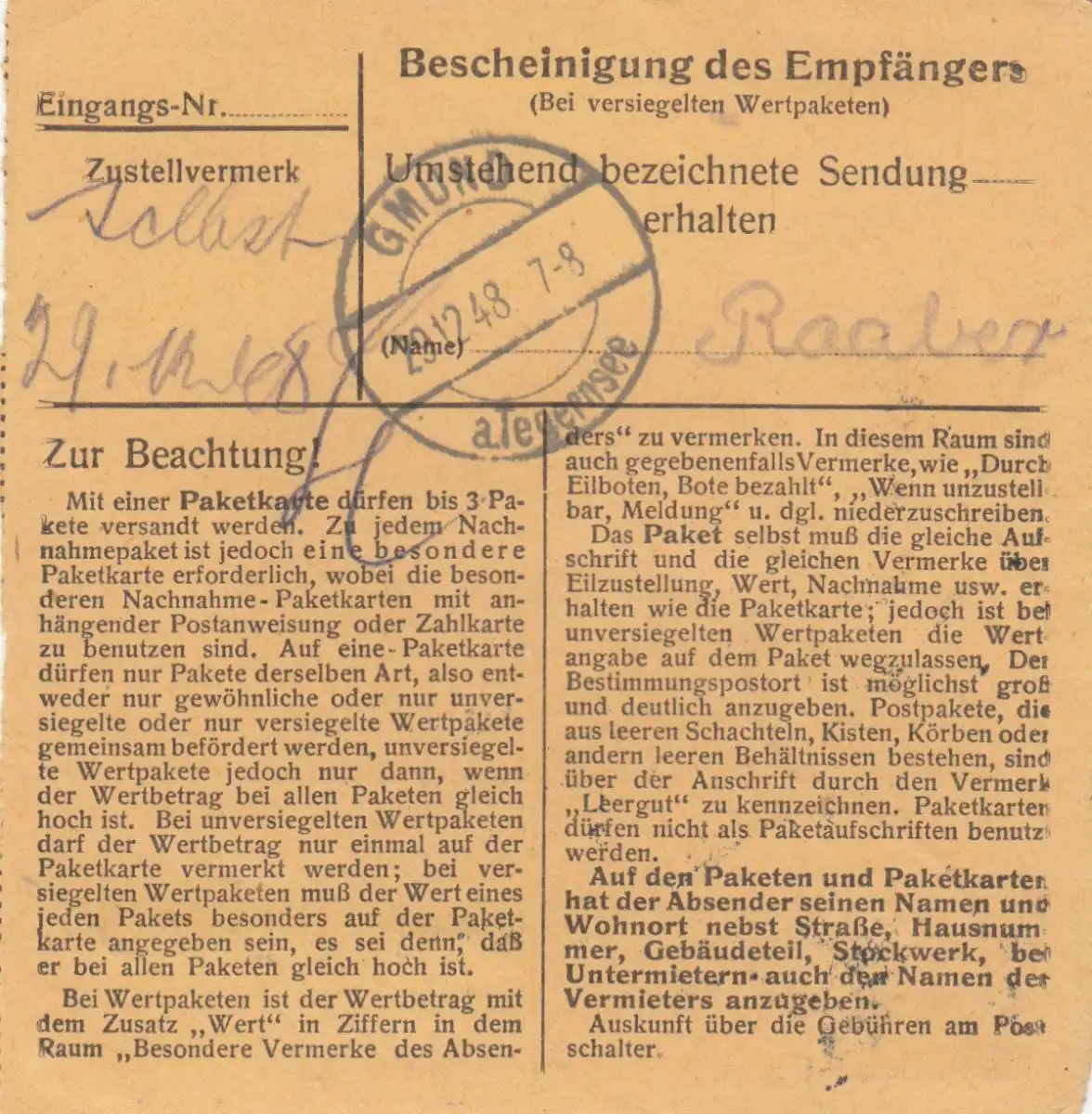 Carte de paquet BiZone 1948: Nuremberg vers Moosrain