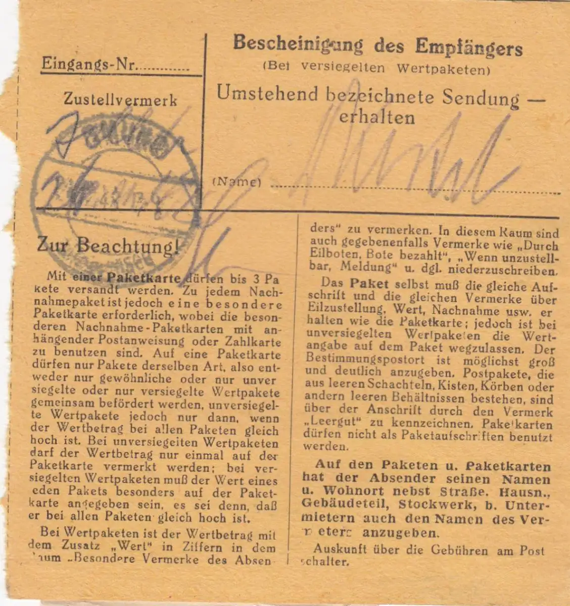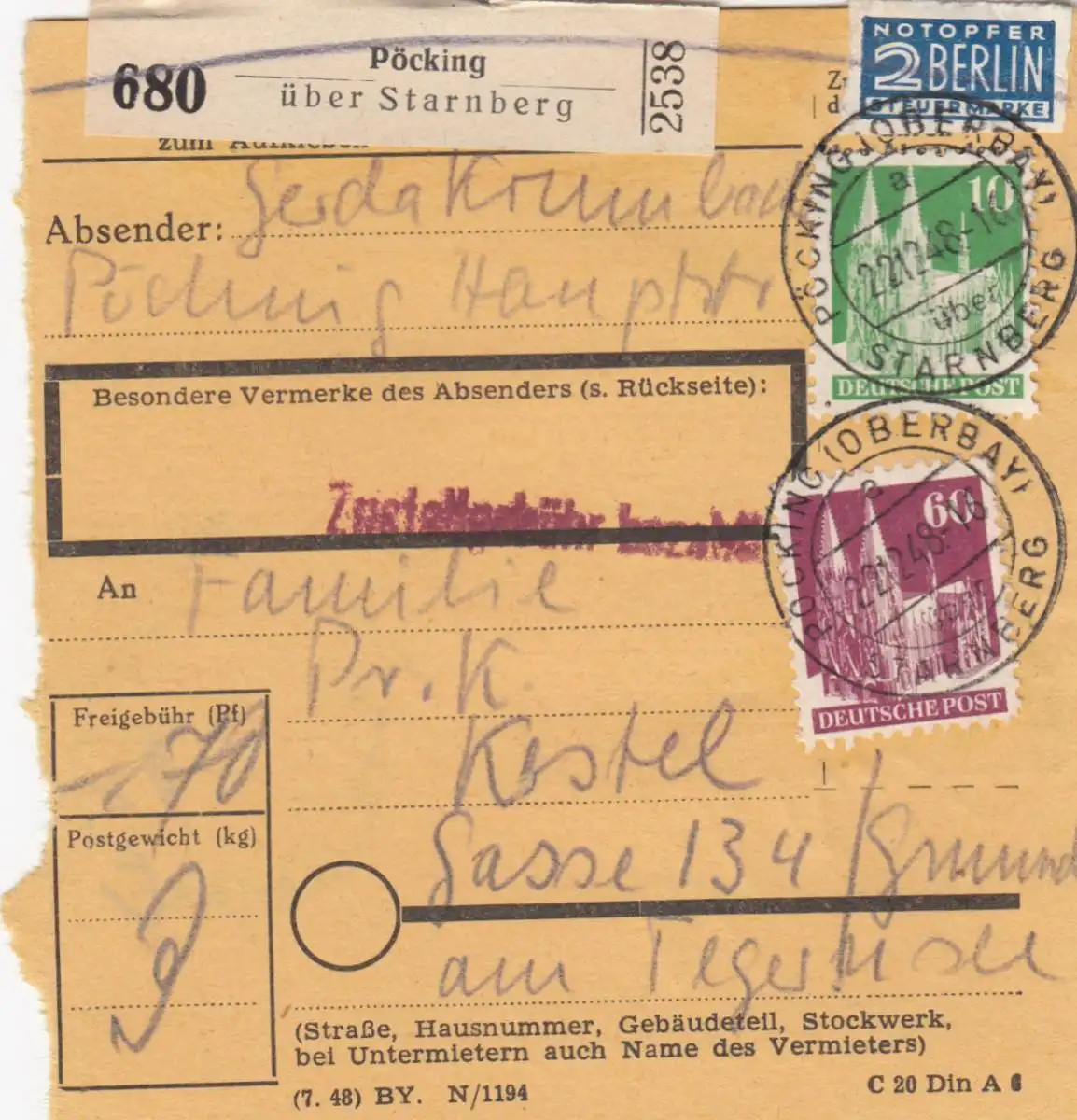 Carte de paquet BiZone 1948: Pöking vers Gmund am Tegernsee