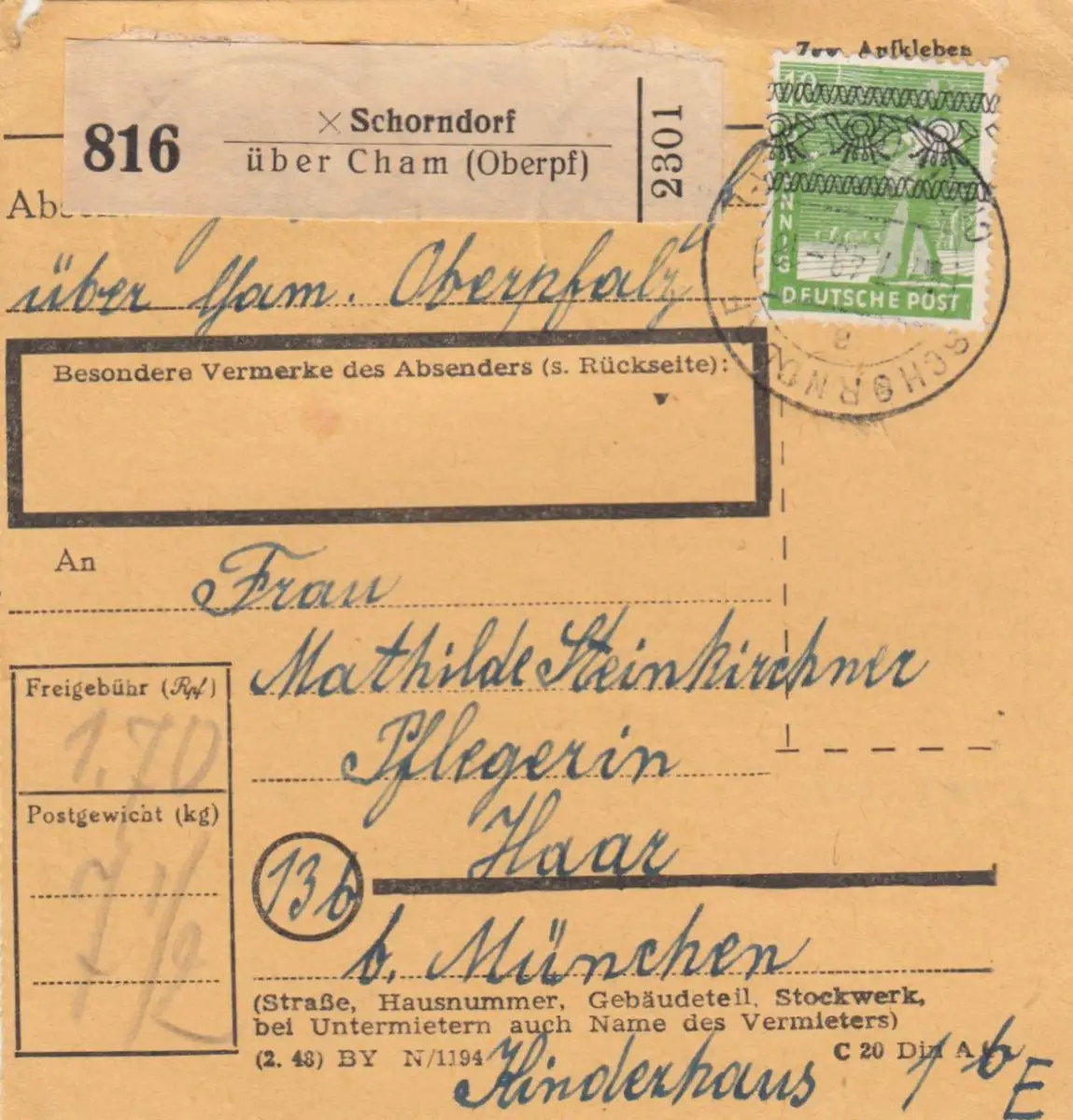 Carte de paquet BiZone 1948: Schorndorf via Cham après Haar, Kinderhaus