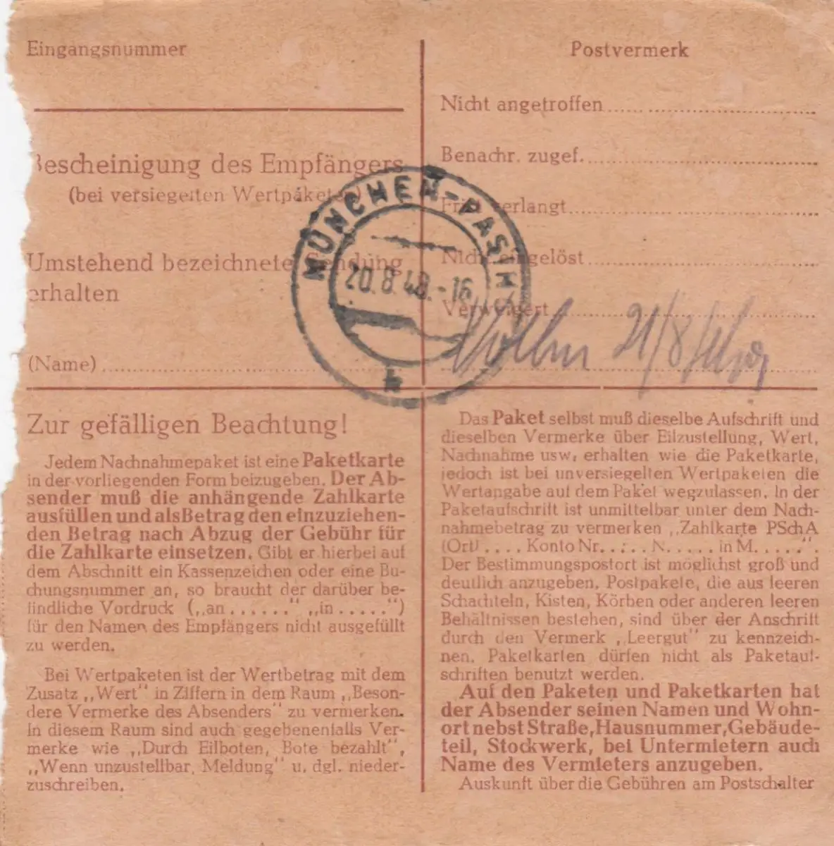 Carte de paquet BiZone 1948: Schwabach, Auto-bookeur, remboursement, frais supplémentaires