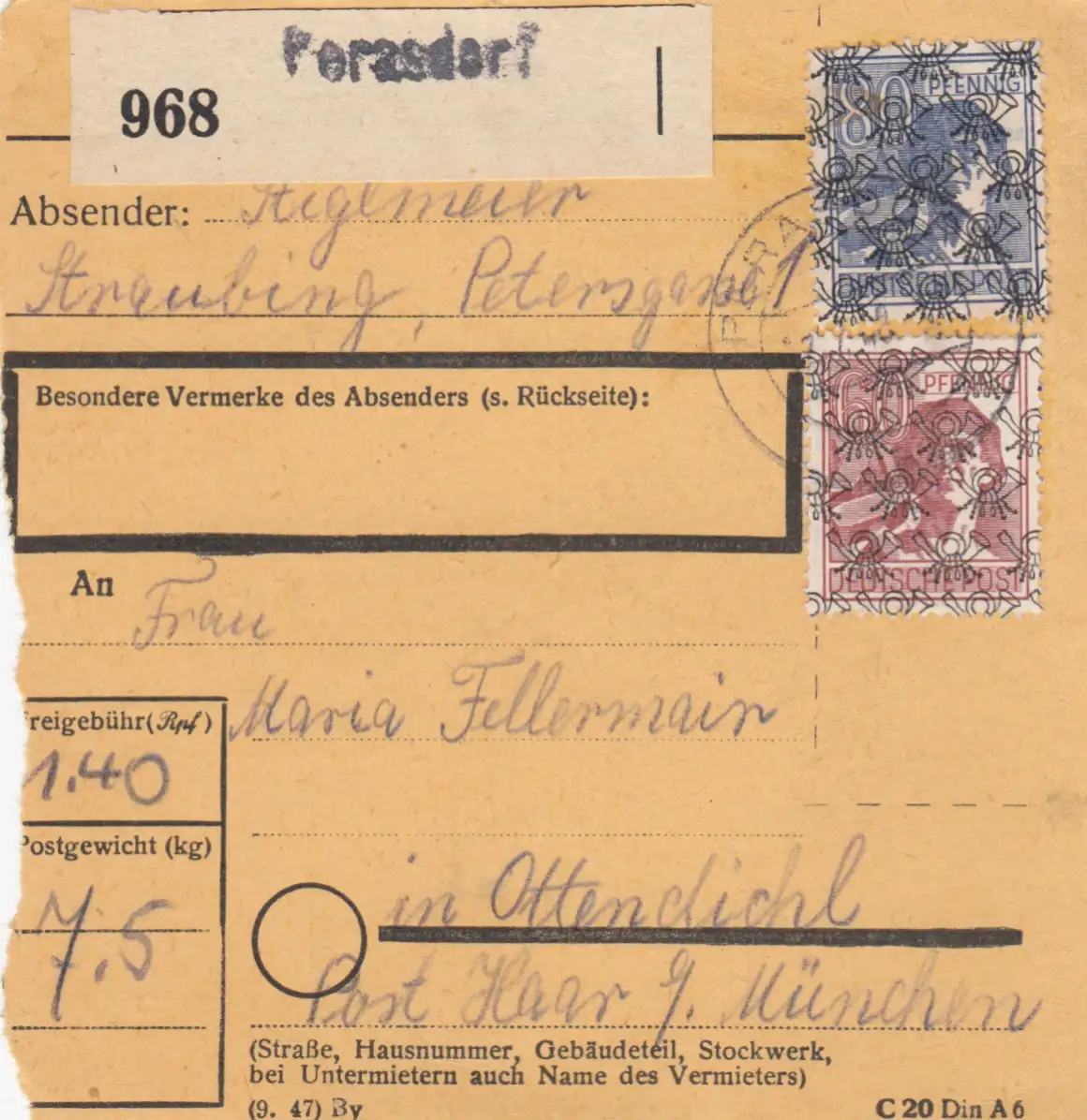 Carte de paquet BiZone 1948: Straubing Perasdorf vers Ottendihl
