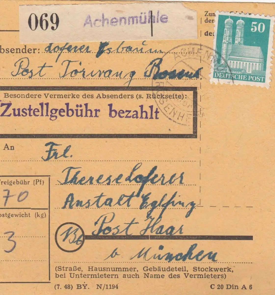Carte de paquet BiZone: Achenmühle selon établissement Eglfing, cheveux